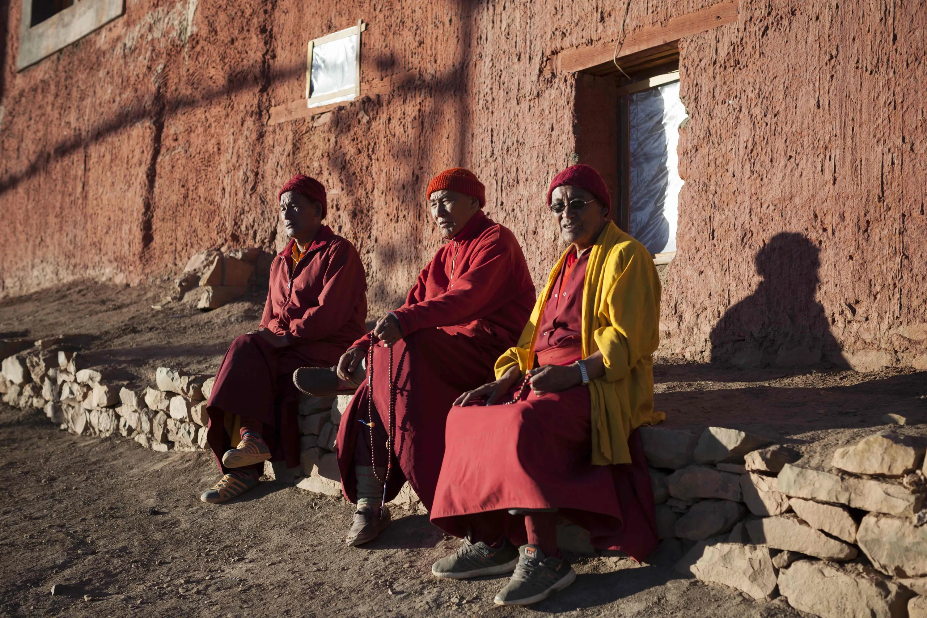 In this photograph taken on July 7, 2018, Indian Buddhist monks Nawang Tsultrim (L), 54, Lobzan Nyenda (C), 68, and Tashi Jamphel,71, sit in the afternoon sun while praying at Tnagyud Gompa monastery in Komik in Spiti Valley in the northern state of Himachal Pradesh. Many monks and followers came to the region after Tibet fell under Chinese rule almost 50 years ago. (Photo by Xavier Galiana/AFP Photo)