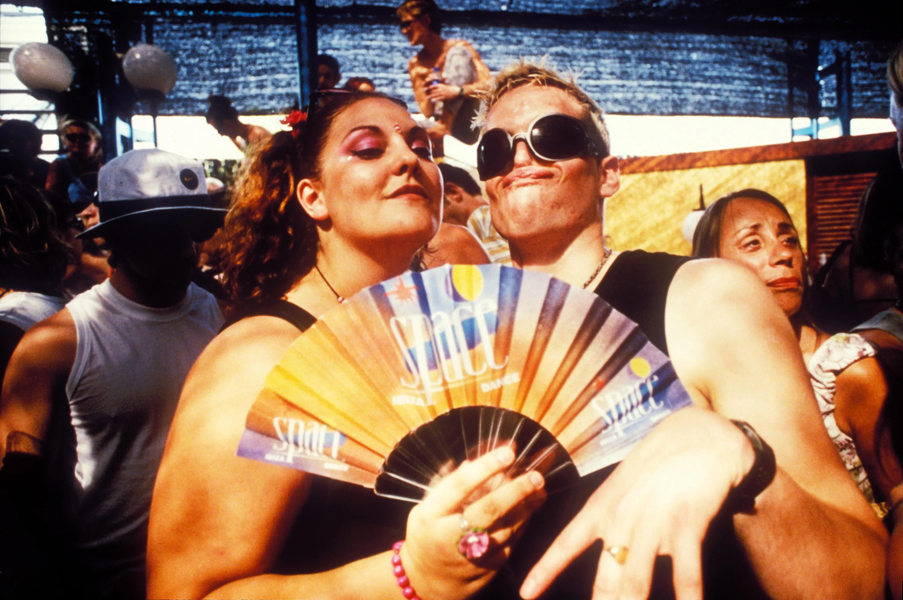 Woman fanning man with black shaded goggles, Space, Ibiza, 1999. (Photo by PYMCA/UIG via Getty Images)