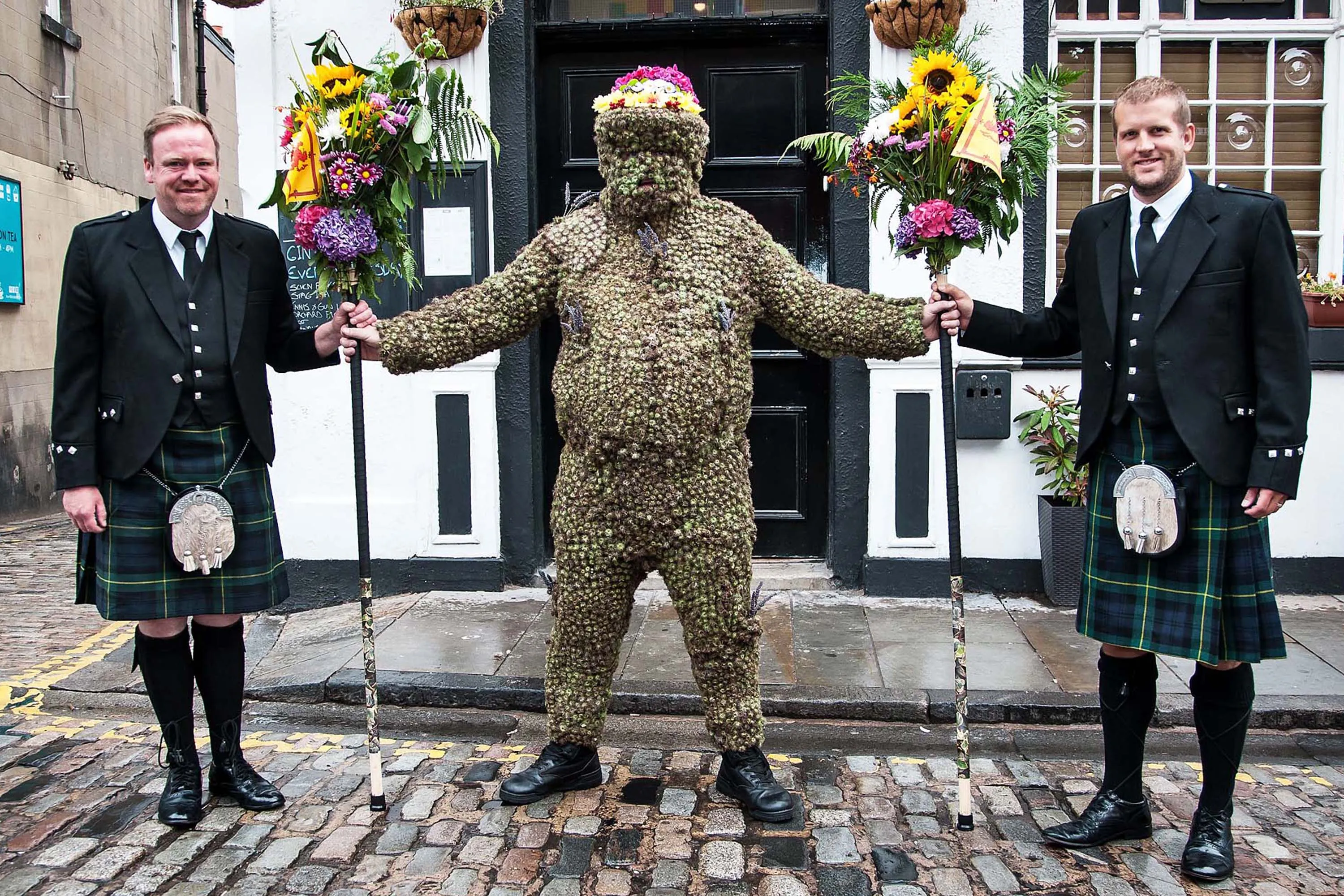Andrew Taylor, the Burryman, parades around the streets of South Queensferry, Scotland on August 10, 2018, following a tradition dating from the 1600s. Sewn into a suit covered with burrs, the Burryman walks through the town from early morning until evening, drinking whisky en route. (Photo by Tina Norris/Rex Features/Shutterstock)