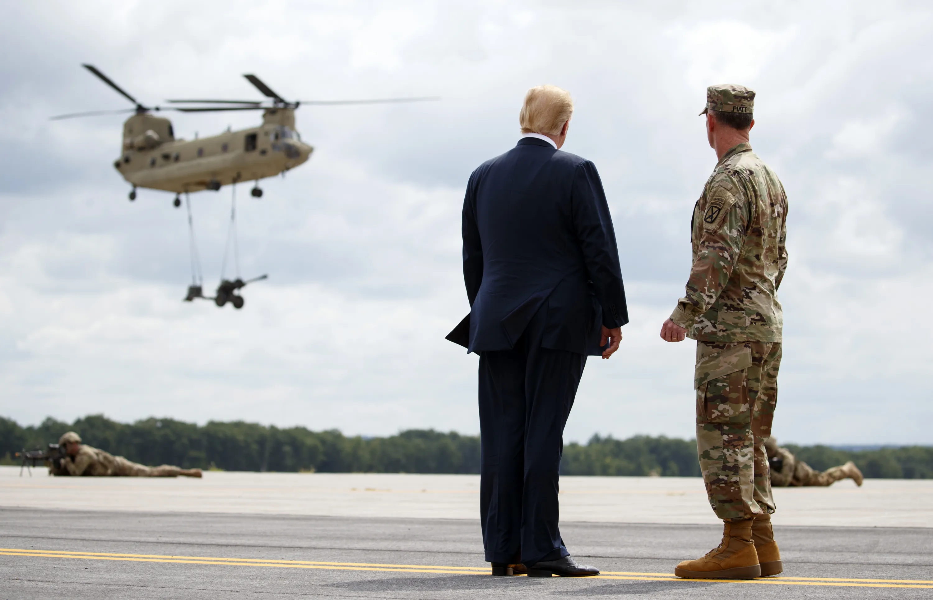 President Donald Trump and Maj. Gen. Walter Piatt view air assault exercises at Fort Drum, N.Y., Monday, August 13, 2018, before a signing ceremony for a $716 billion defense policy bill named for Sen. John McCain. (Photo by Carolyn Kaster/AP Photo)