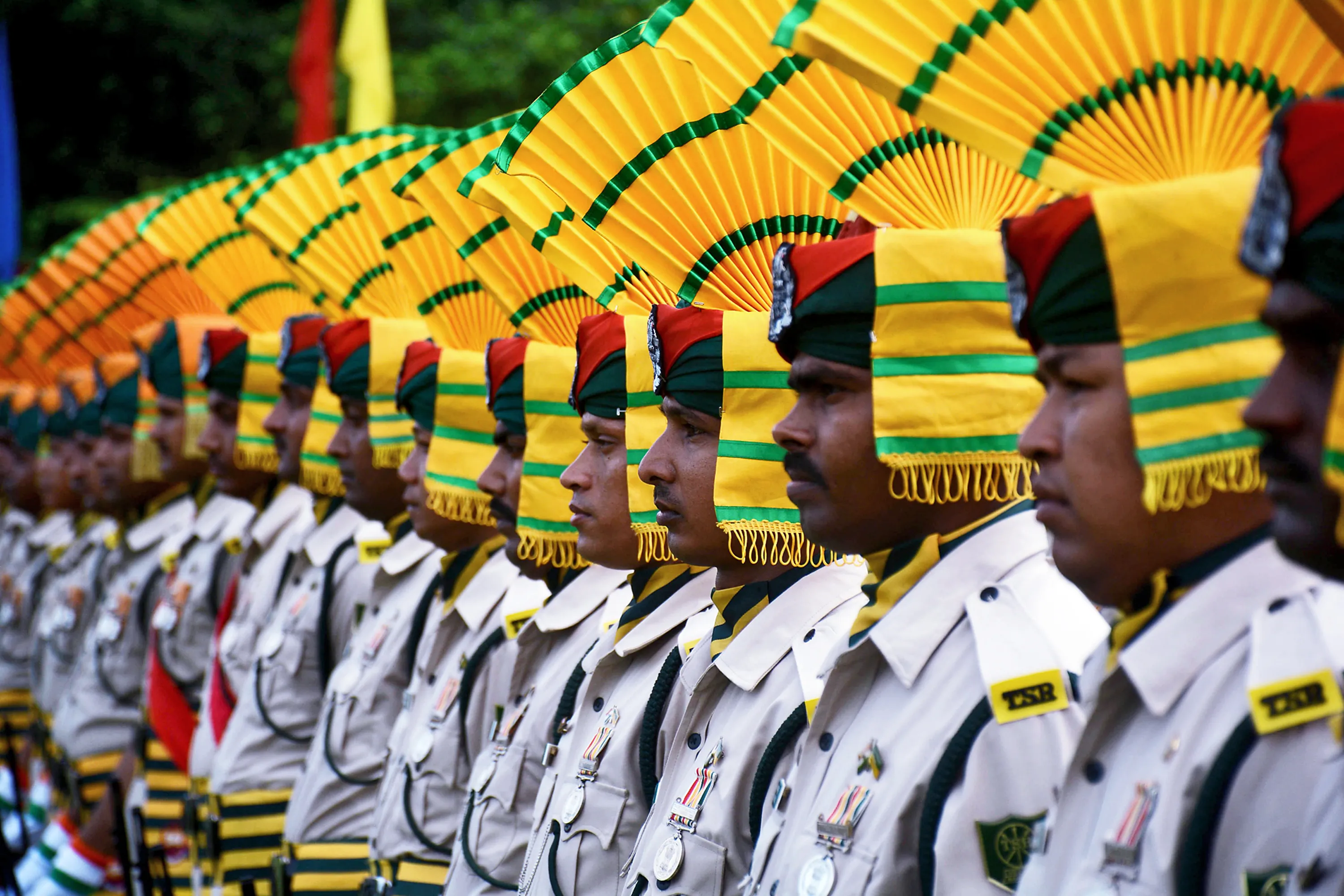 Indian paramilitary force personnel march pasts during the final dress rehearsal ahead of Independence Day celebration in Agartala, the capital of northeastern state of Tripura on August 13, 2018. August 15th to commemorate the nation's independence from the United Kingdom on 15 August 1947. (Photo by Arindam Dey/AFP Photo)