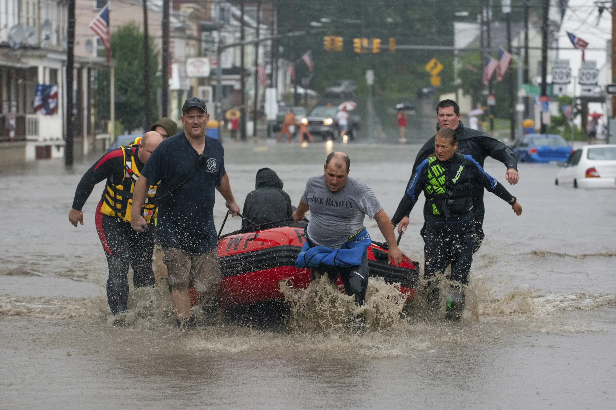 The Ryan Township dive team uses a boat to transport a person for medical problems along Pike Street in Port Carbon, Pa., on Monday, August 13, 2018. Overnight rains triggered flash flooding in parts of central and eastern Pennsylvania on Monday, closing down a heavily traveled interstate and sending water into homes in the mountainous coal regions. (Photo by David McKeown/Republican-Herald via AP Photo)