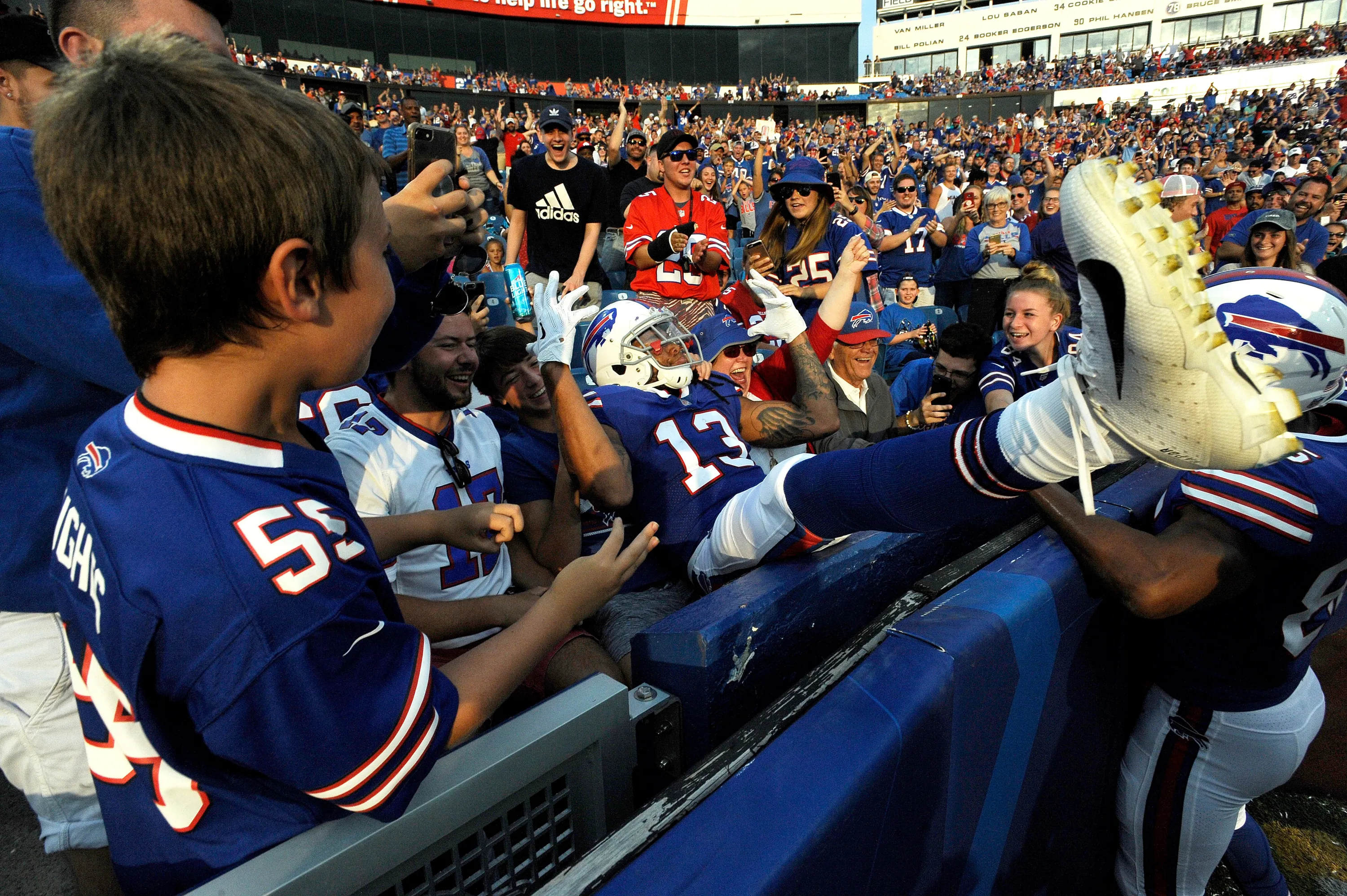 Buffalo Bills wide receiver Kelvin Benjamin, center, dives into the first row of the stands after catching a touchdown pass from quarterback Nathan Peterman during the first half of an NFL football game against the Carolina Panthers, Thursday, August 9, 2018, in Orchard Park, N.Y. (Photo by Adrian Kraus/AP Photo)