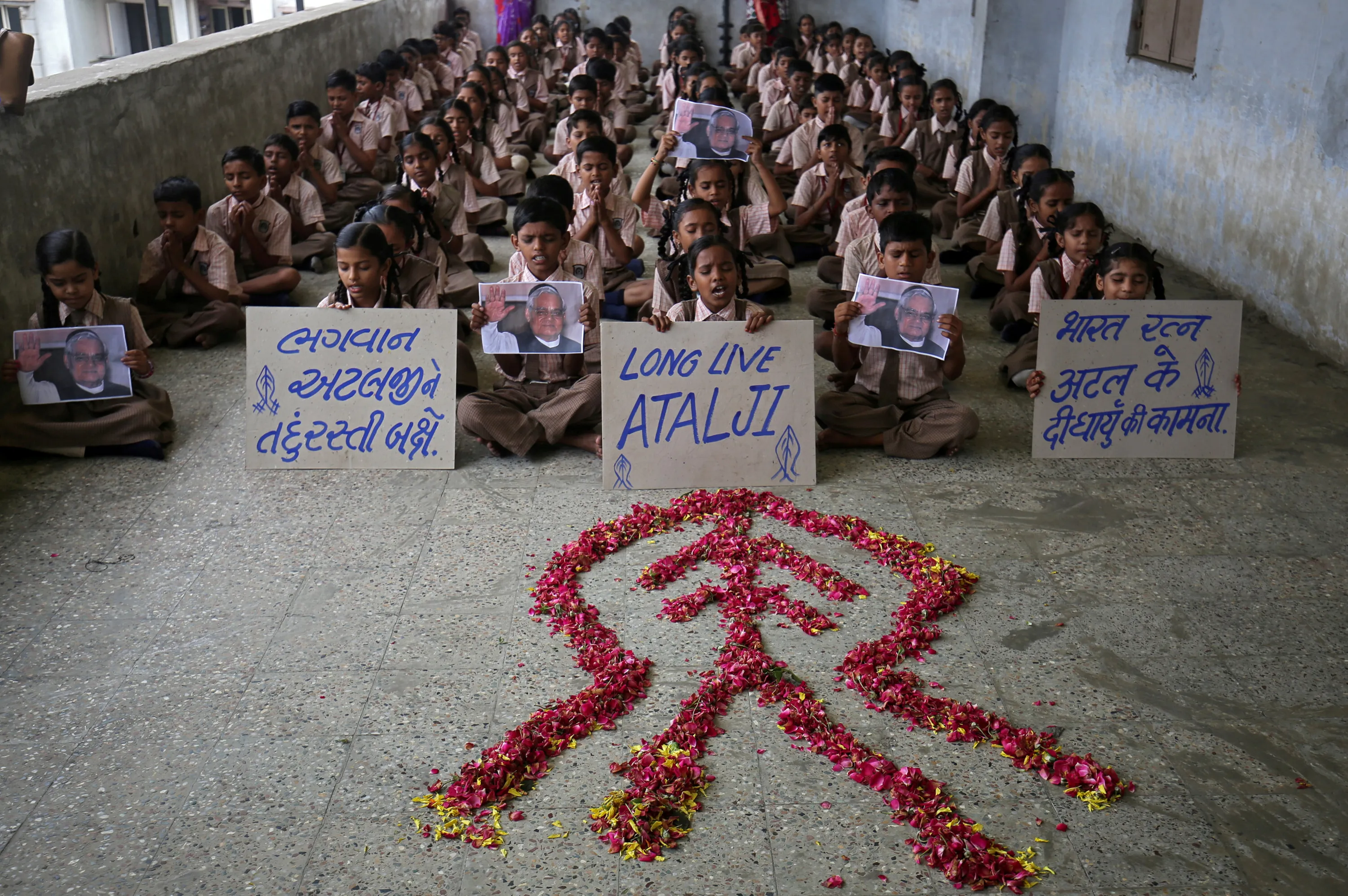 Schoolchildren pray for the speedy recovery of India's former prime minister Atal Bihari Vajpayee, inside a school in Ahmedabad, India, August 16, 2018. (Photo by Amit Dave/Reuters)