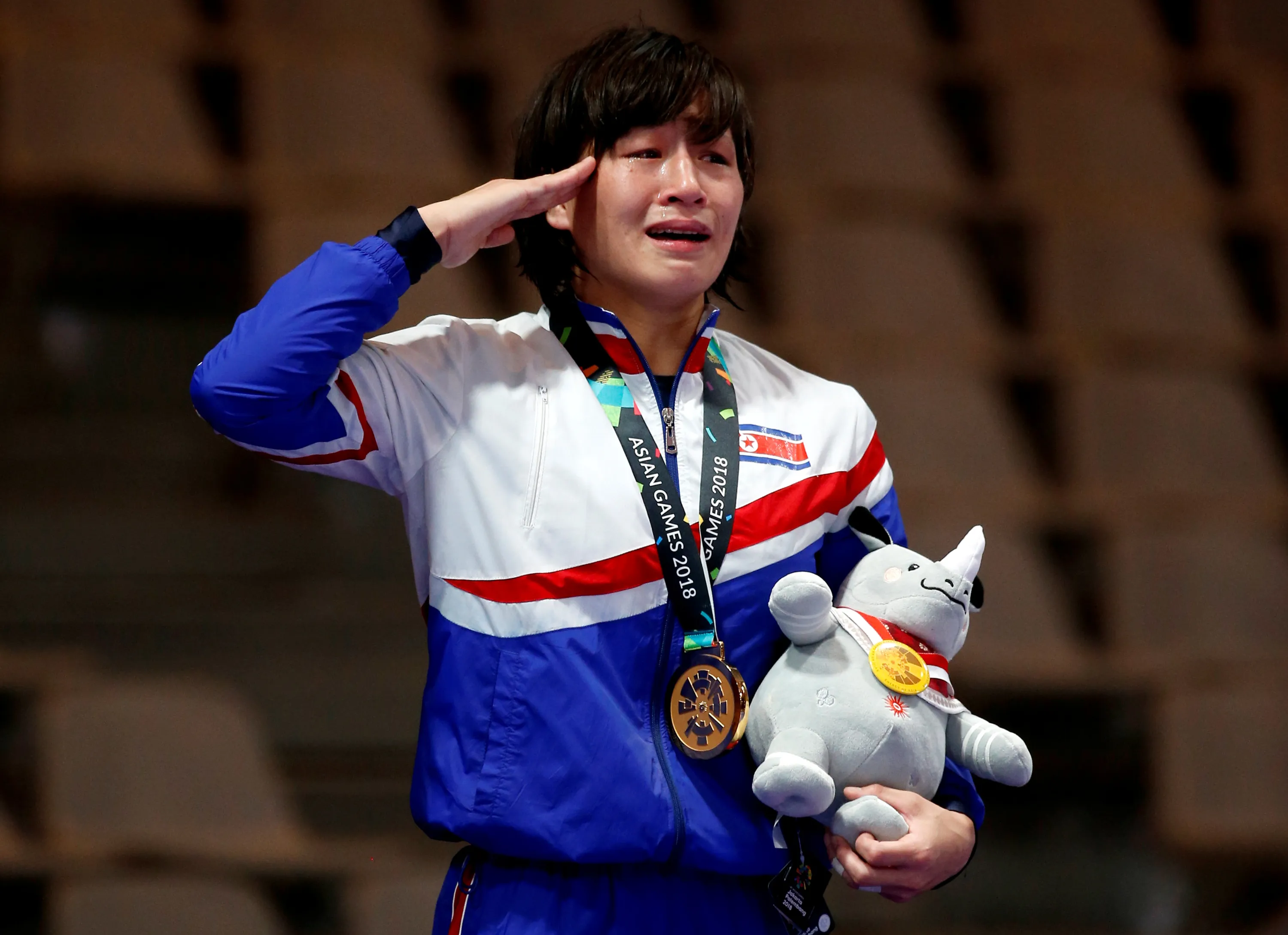North Korea' s Jong Myong Suk poses with her gold medal at the women' s freestyle 57 kg wrestling medal ceremony at the 2018 Asian Games in Jakarta on August 20, 2018. (Photo by Willy Kurniawan/Reuters)