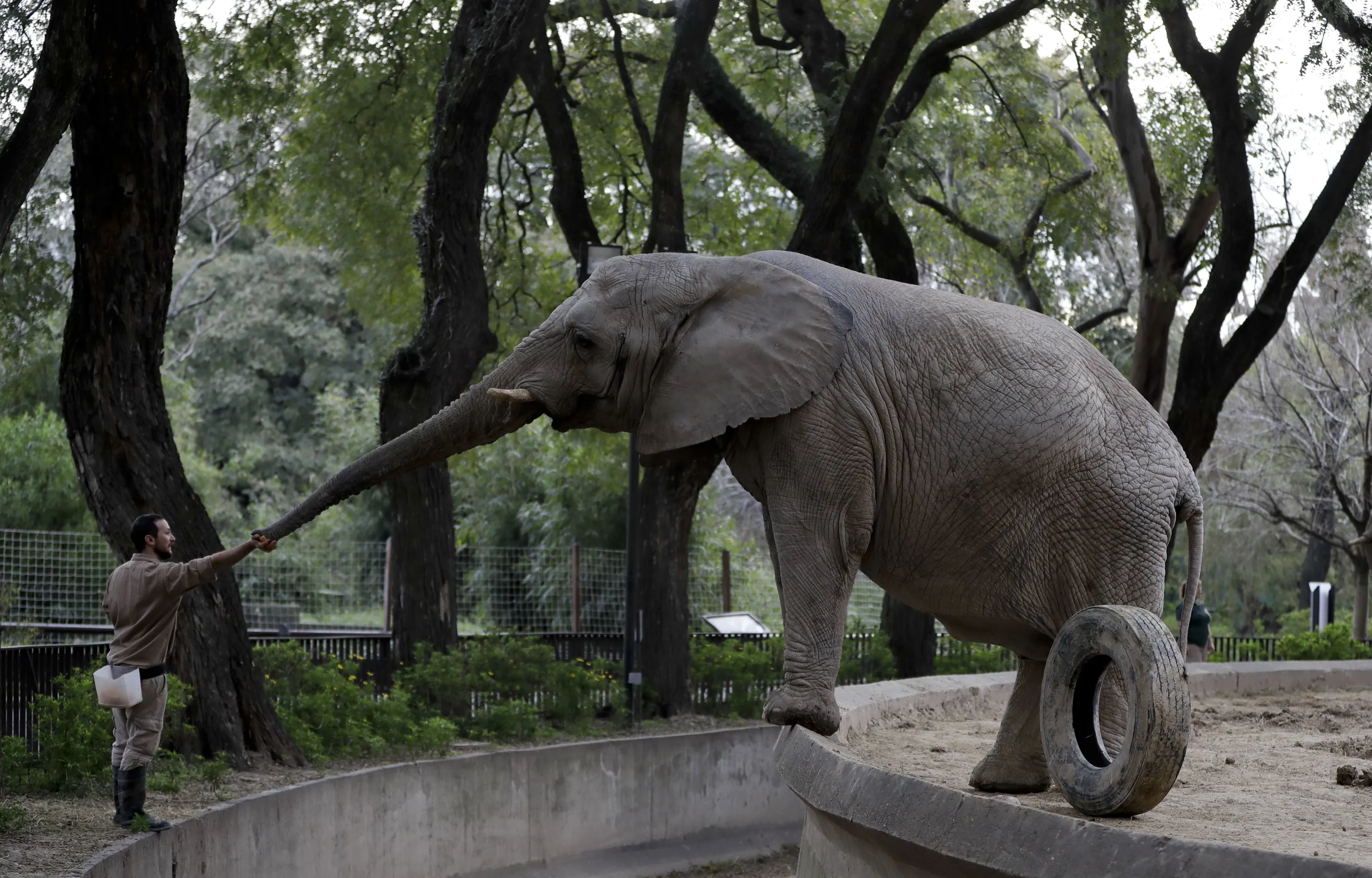 In this August 7, 2018 photo, Zoo Keeper Mariano Narvaez trains Pupy, and African elephant at the “eco-park” in Buenos Aires, Argentina. A giraffe and a rhinoceros recently died at the former Buenos Aires zoo. Conservationists say that it is the latest sign of a poorly planned attempt by the city government to turn the 140-year-old zoo into a park and relocate most of its 1,500 animals to sanctuaries. (Photo by Natacha Pisarenko/AP Photo)