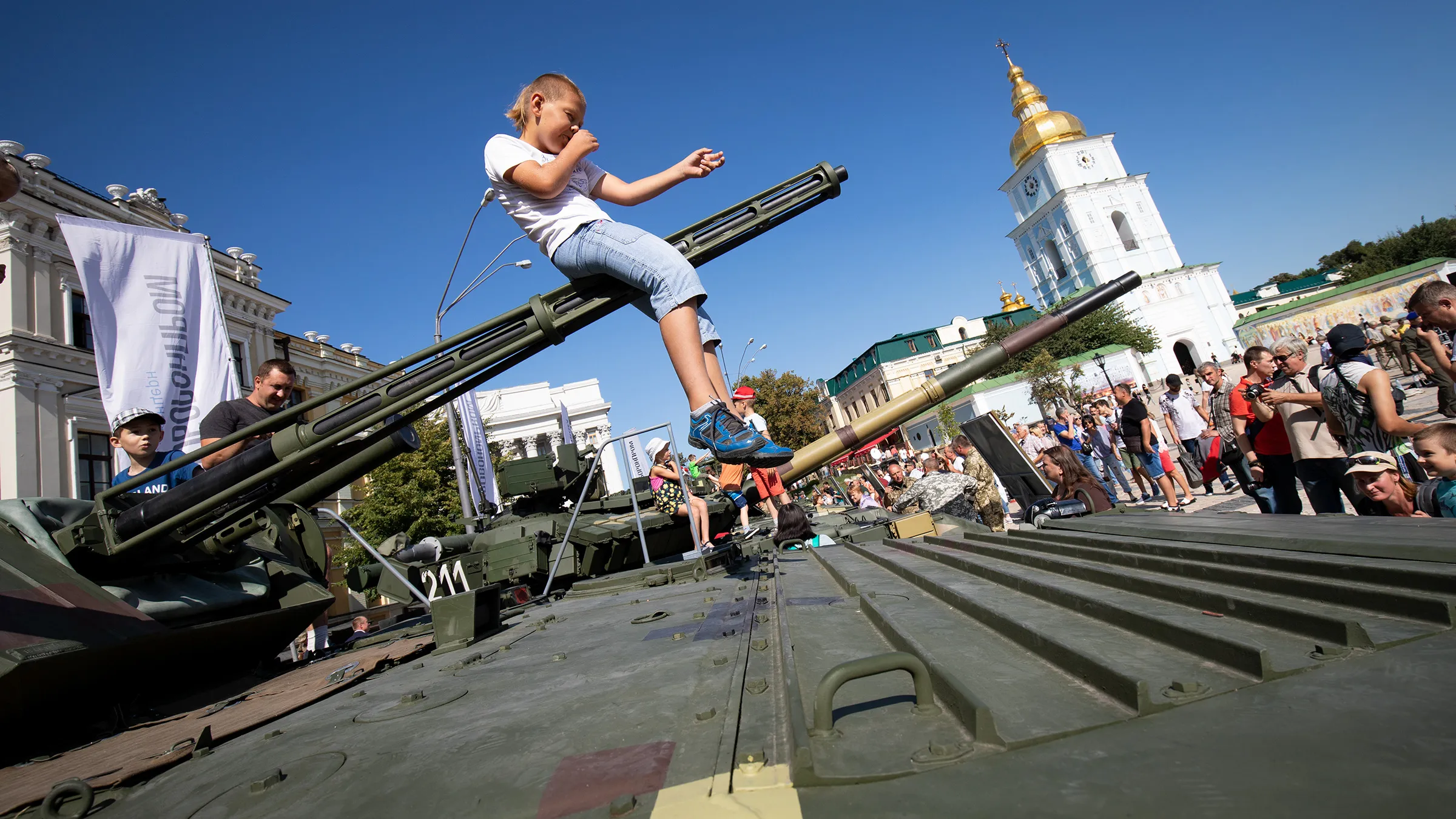 A child plays on a gun at an exhibition of modern weapons and military equipment in Kyiv to coincide with Ukraine's Independence Day in Kiev, Ukraine on August 24, 2018. (Photo by Andriy Dubchak/Radio Free Europe/Radio Liberty)