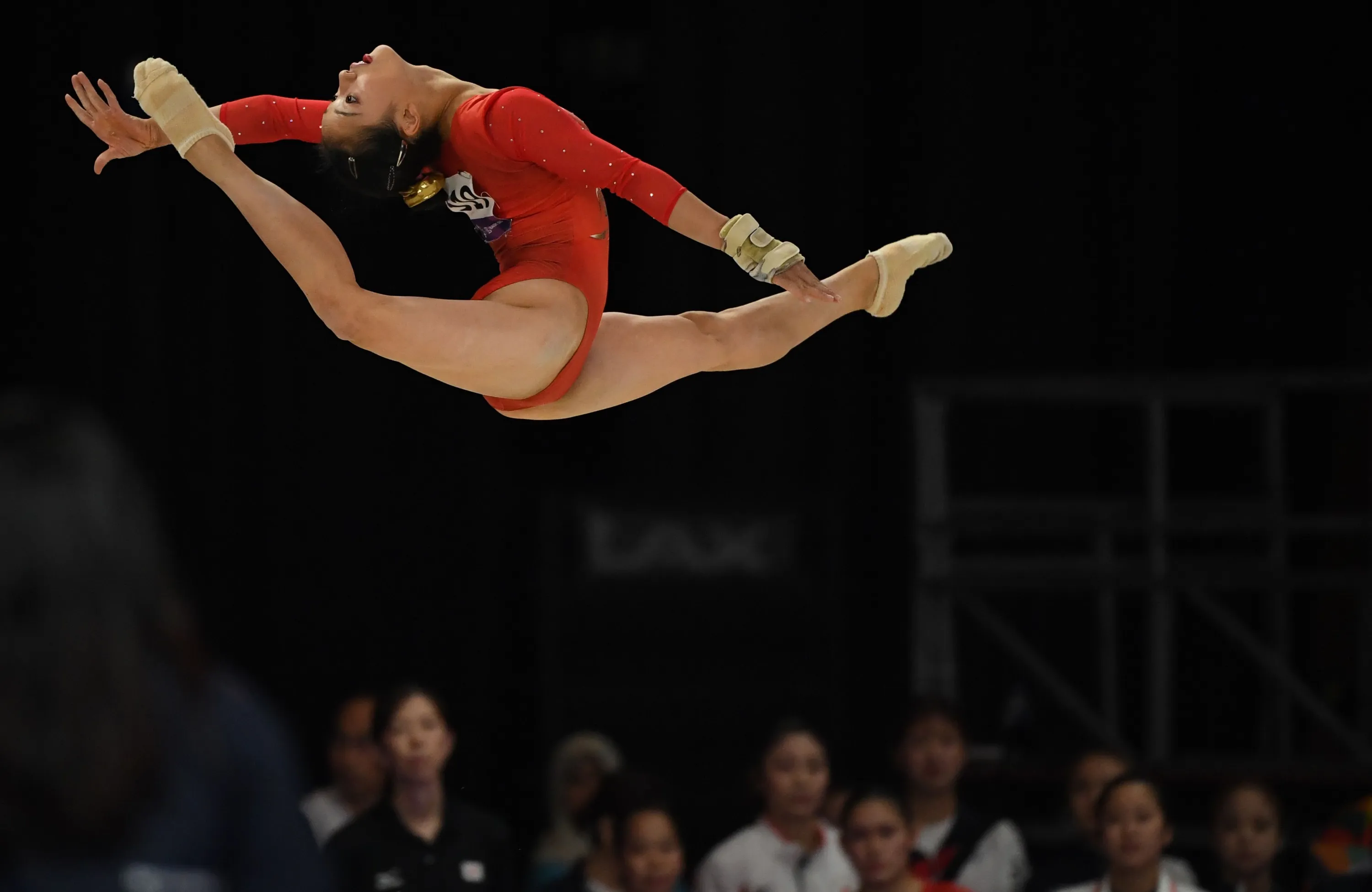 Japan's Shiho Nakaji competes in the floor exercise the women's team final of the artistic gymnastics event during the 2018 Asian Games in Jakarta on August 22, 2018. (Photo by Peter Parks/AFP Photo)