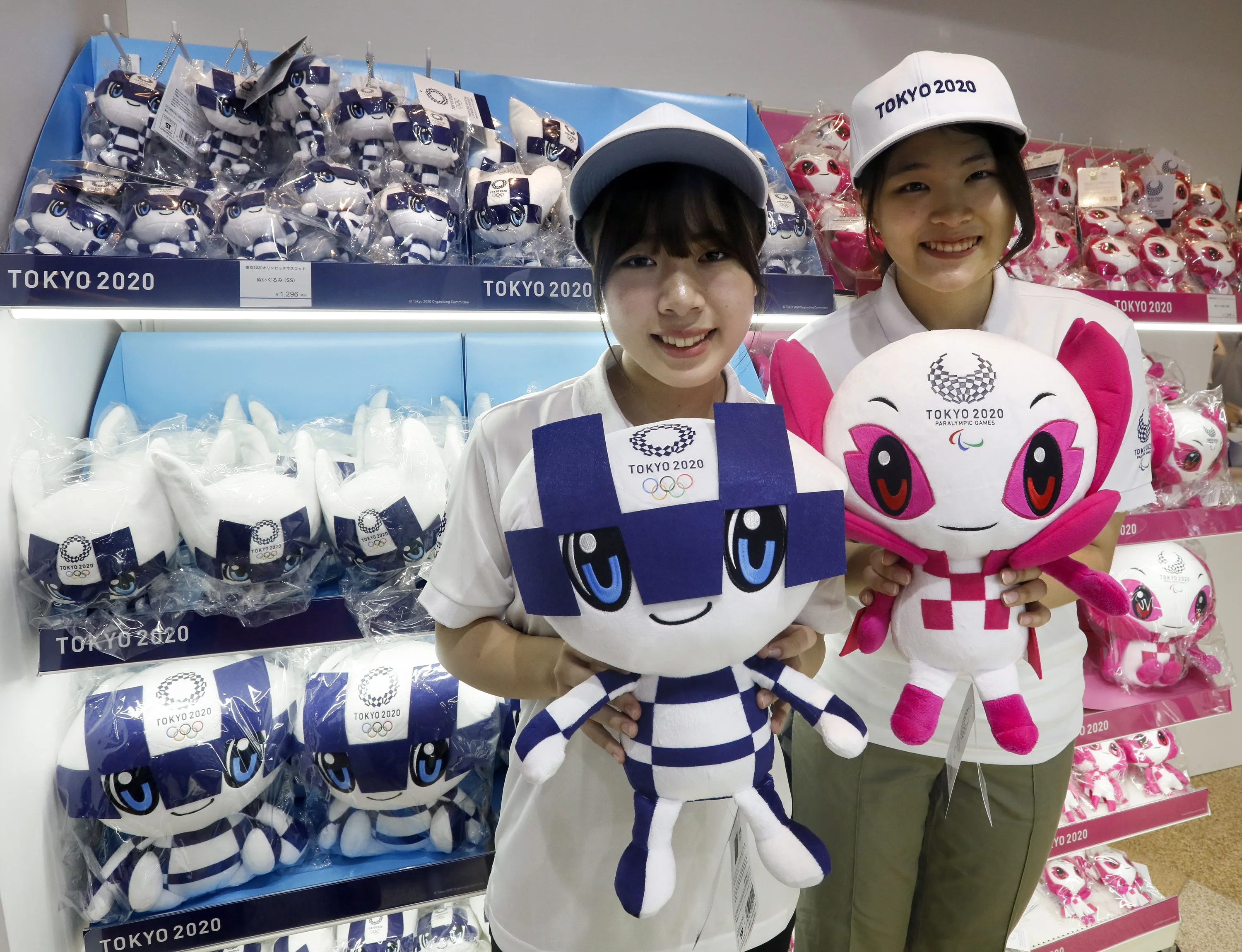 Tokyo 2020 official mascot house staff promote for sale Olympics mascot Miraitowa (L) and Paralympics mascot Someity after the mascot made debut in Tokyo, Japan, 22 July 2018. Tokyo 2020 Olympics will start on 24 July 2020 and run until 09 August 2020. (Photo by Kimimasa Mayama/EPA/EFE)