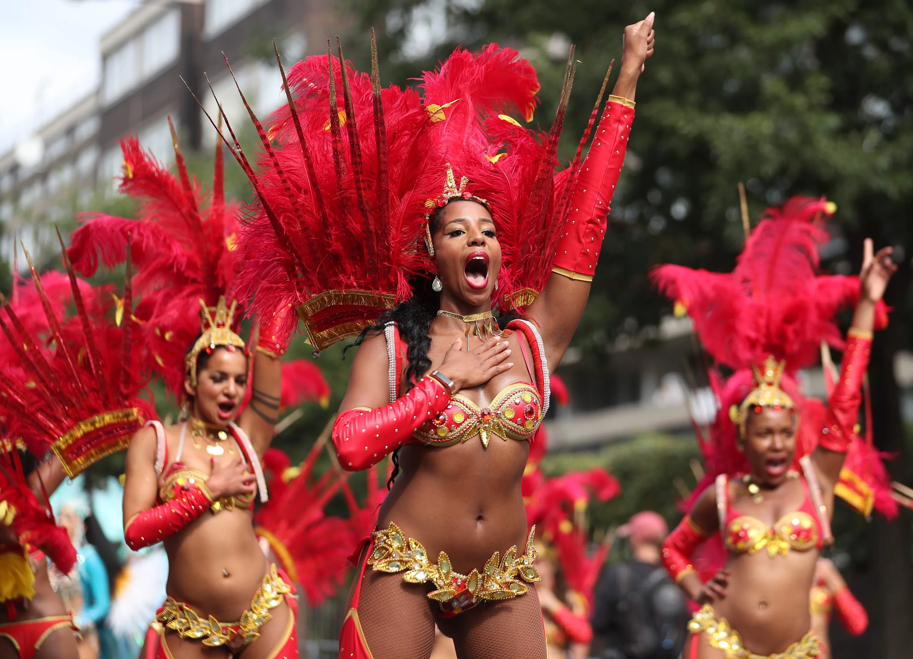 Performers in costume take part in the carnival on the main Parade day of the Notting Hill Carnival in west London on August 27, 2018. Nearly one million people are expected by the organizers Sunday and Monday in the streets of west London' s Notting Hill to celebrate Caribbean culture at a carnival considered the largest street demonstration in Europe. (Photo by Daniel Leal-Olivas/AFP Photo)