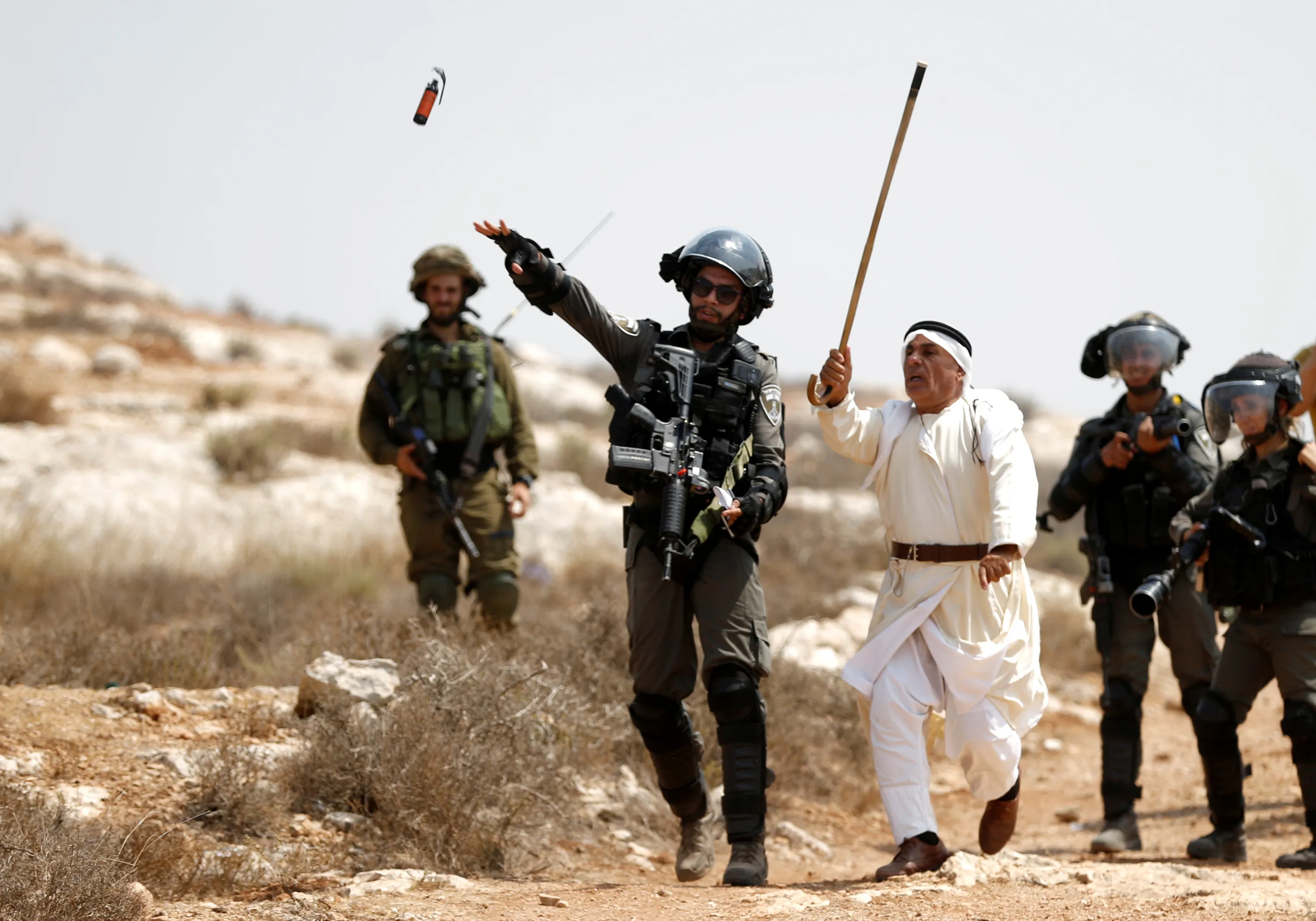 A Palestinian demonstrator gestures as an Israeli border police officer throws a sound grenade during a protest against Israeli settlement construction, in the village of Ras Karkar, near Ramallah in the occupied West Bank, August 31, 2018. (Photo by Mohamad Torokman/Reuters)