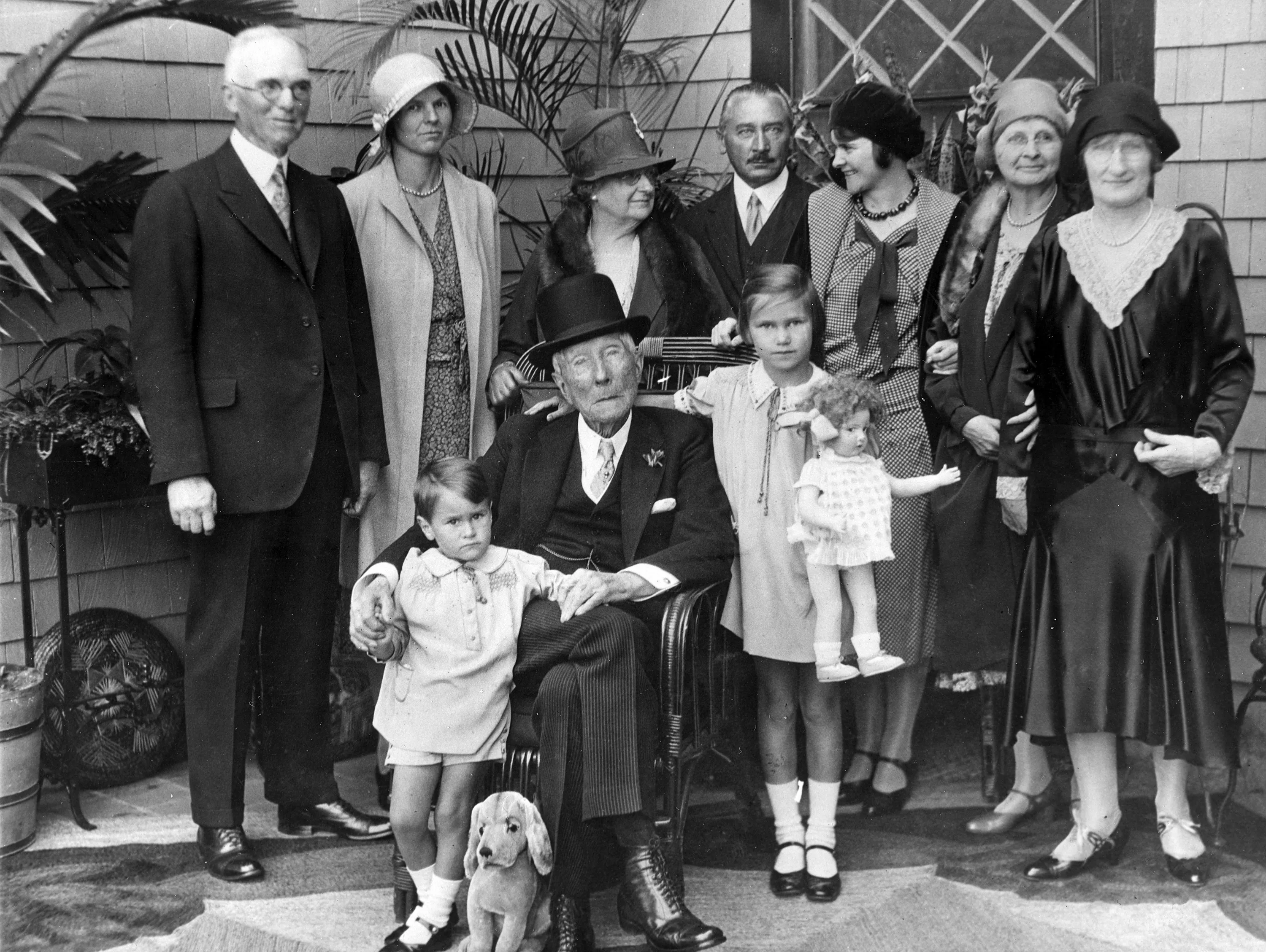 John D. Rockefeller, center, is surrounded by relatives and friends in Ormund Beach, Fla., on May 23, 1931. From left to right are, John P. White, Cleveland, a close friend; Betty White; Fannie Evans, a second cousin; Max Oser and Mathilde Oser, daughter of the late Edith Rockefeller McCormick, visiting with her husband from Switzerland; Mrs. White; and Mrs. Mitchell, who often reads to Rockefeller. Rockefeller is seated between Peter and Anita Oser, his great-grandchildren. (Photo by AP Photo/Engelbrecht)