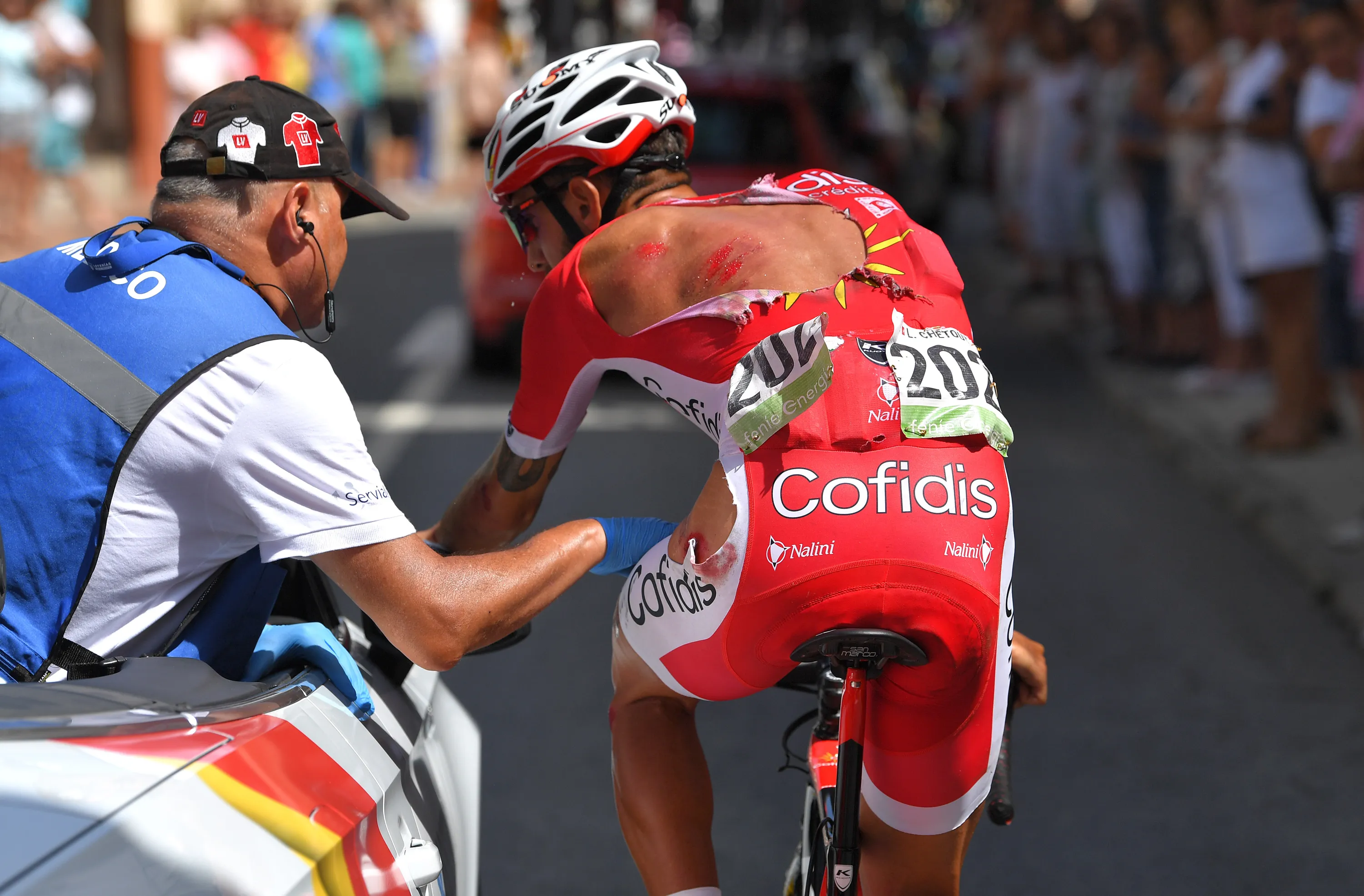 French cyclist Loic Chetout of Team Cofidis receives treatment for injuries caused by a fall during the 208km Talavera de la Reina to Alto de la Covatilla stage nine of La Vuelta, Spain on September 2, 2018. (Photo by Tim de Waele/Getty Images)