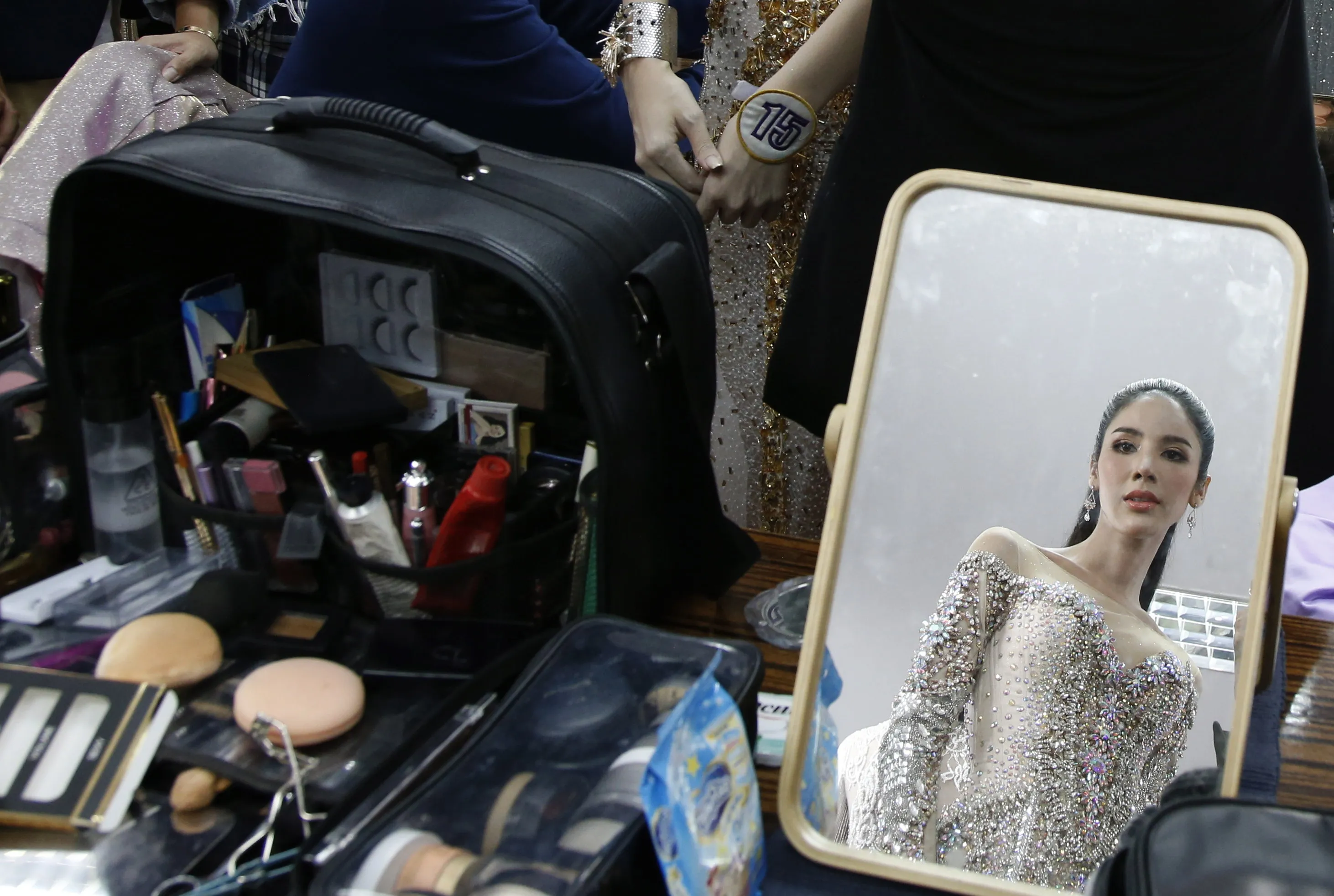 A contestant for Miss Tiffany's Universe Thailand 2018 is seen in a mirror as she gets ready backstage during the annual transgender beauty contest “Miss Tiffany's Universe Thailand 2018” at the Tiffany's Show Theatre in Pattaya city, Chonburi province, Thailand, 31 August 2018. (Photo by Narong Sangnak/EPA/EFE)