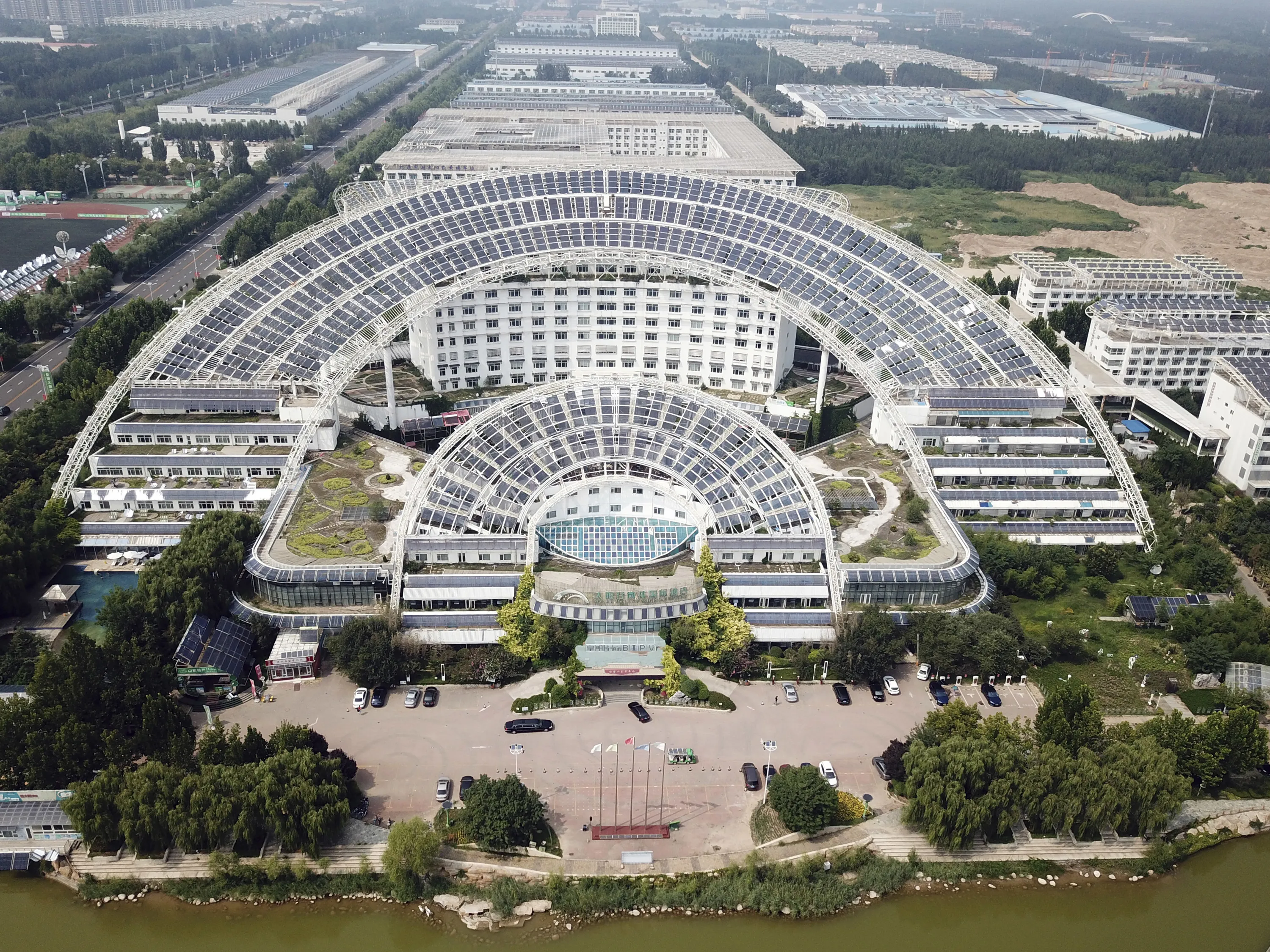 In this Thursday, August 2, 2018, aerial photo, the Micro-E Hotel's massive array of solar panels are spread over its property in Dezhou in the eastern Shandong province in China. The city of Dezhou began a drive to become a solar energy hub in China in 2005 and has since successfully courted national investment and backing. China is the world's biggest consumer and producer of solar technologies. (Photo by Sam McNeil/AP Photo)