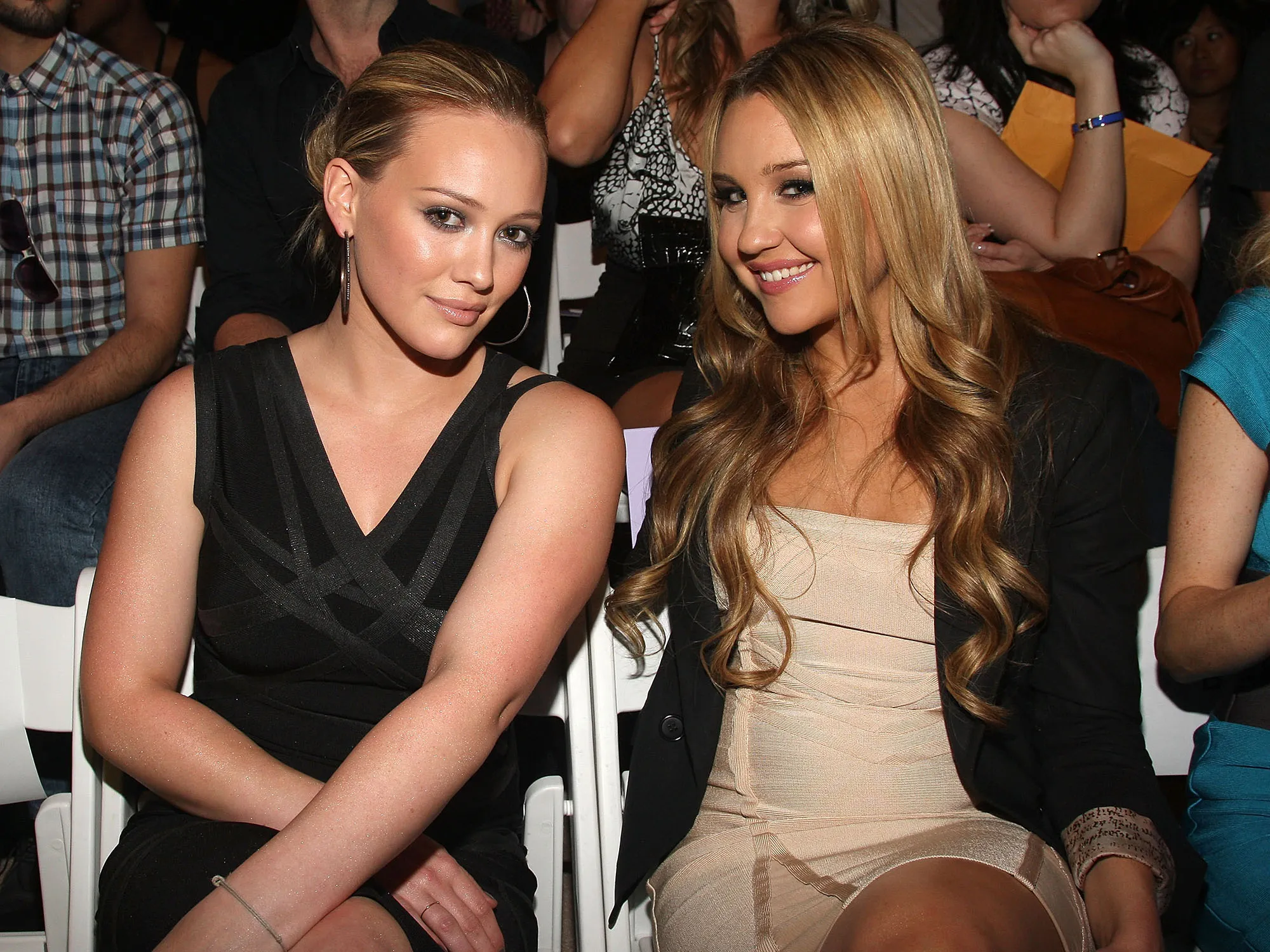 Hilary Duff and Amanda Bynes attend the Herve Leger Spring 2010 Fashion Show at the Promenade at Bryant Park on September 13, 2009 in in New York City. (Photo by Jason Kempin/Getty Images for Herve Leger)