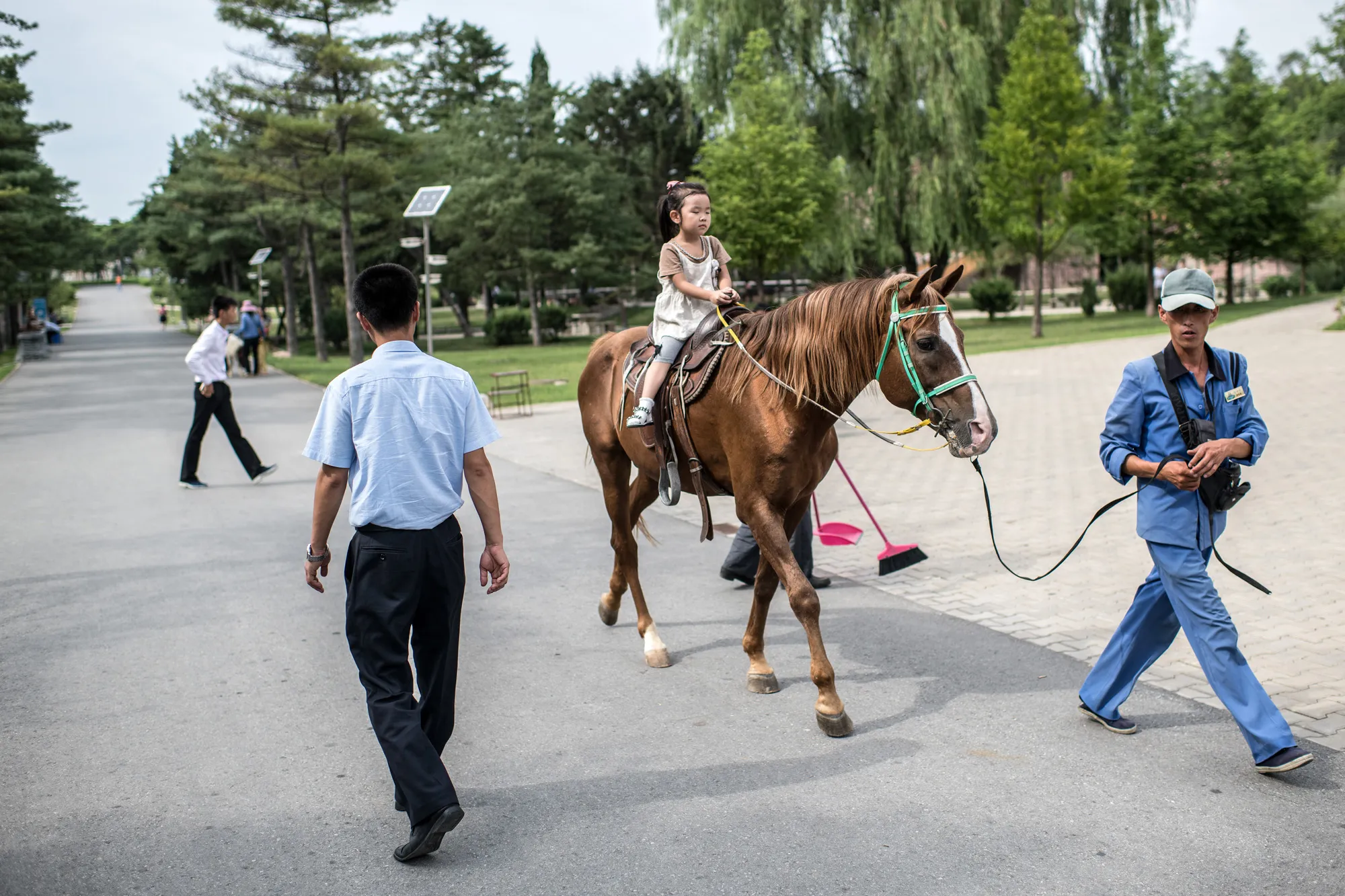 A little girl is given a horse ride in Pyongyang Central Zoo on August 19, 2018 in Pyongyang, North Korea. (Photo by Carl Court/Getty Images)