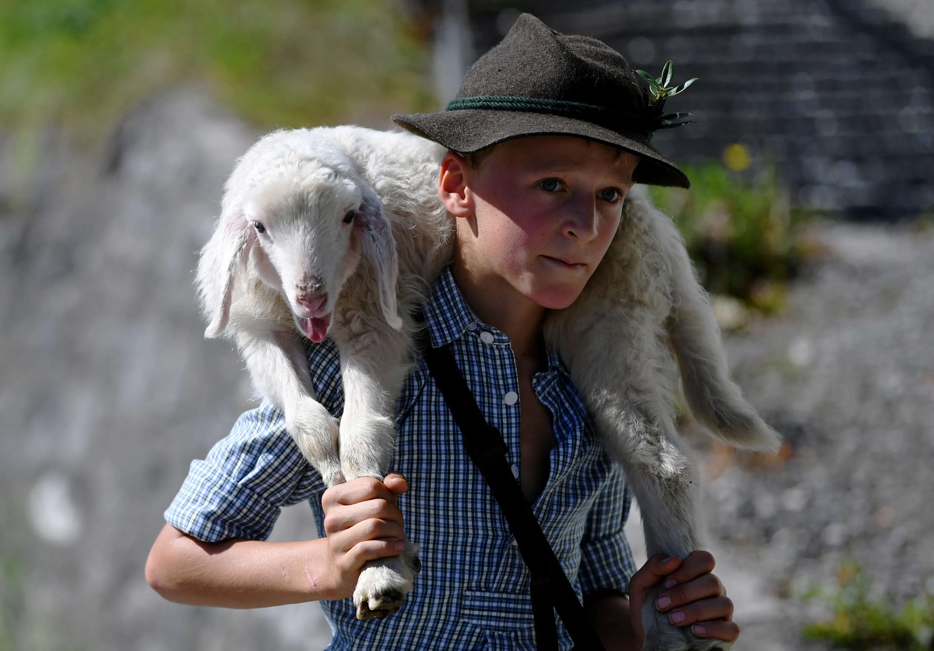 A boy carries a little sheep from its summer pastures in the mountains down to the valley and through the town of Mittenwald during the traditional “Almabtrieb” in Mittenwald, Germany, September 8, 2018. (Photo by Andreas Gebert/Reuters)