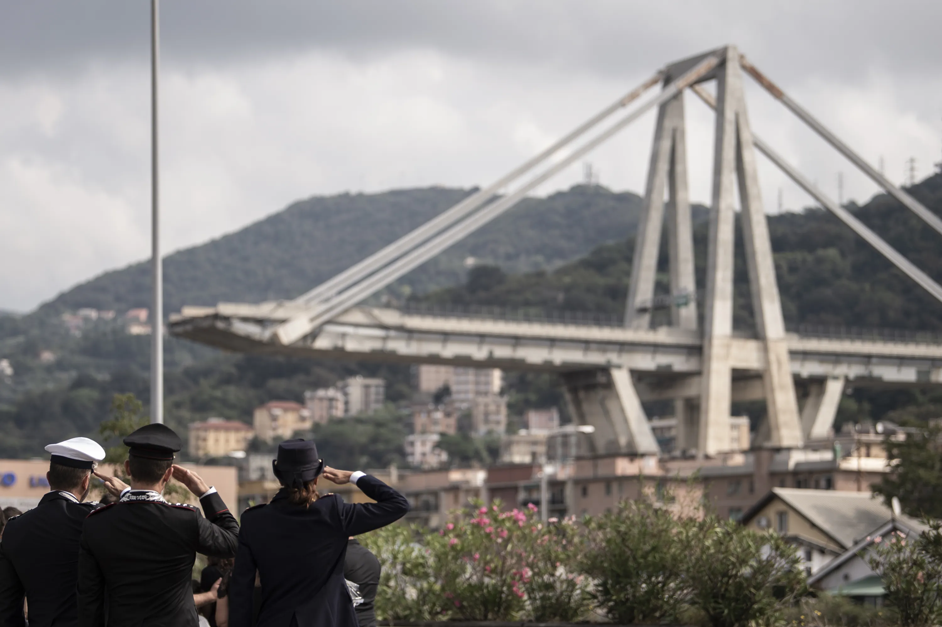 Member of the Italian Police pay tribute to the victims during a minute of silence and a commemoration ceremony near the bridge's wreckage, one month after the Morandi Bridge collapse that killed 43 people, on September 14, 2018 in Genoa. A month after Genoa's Morandi Bridge collapse killed 43 people, the port city is tending to its wounds and those left homeless by the disaster are turning a brave face to the future. (Photo by Marco Bertorello/AFP Photo)