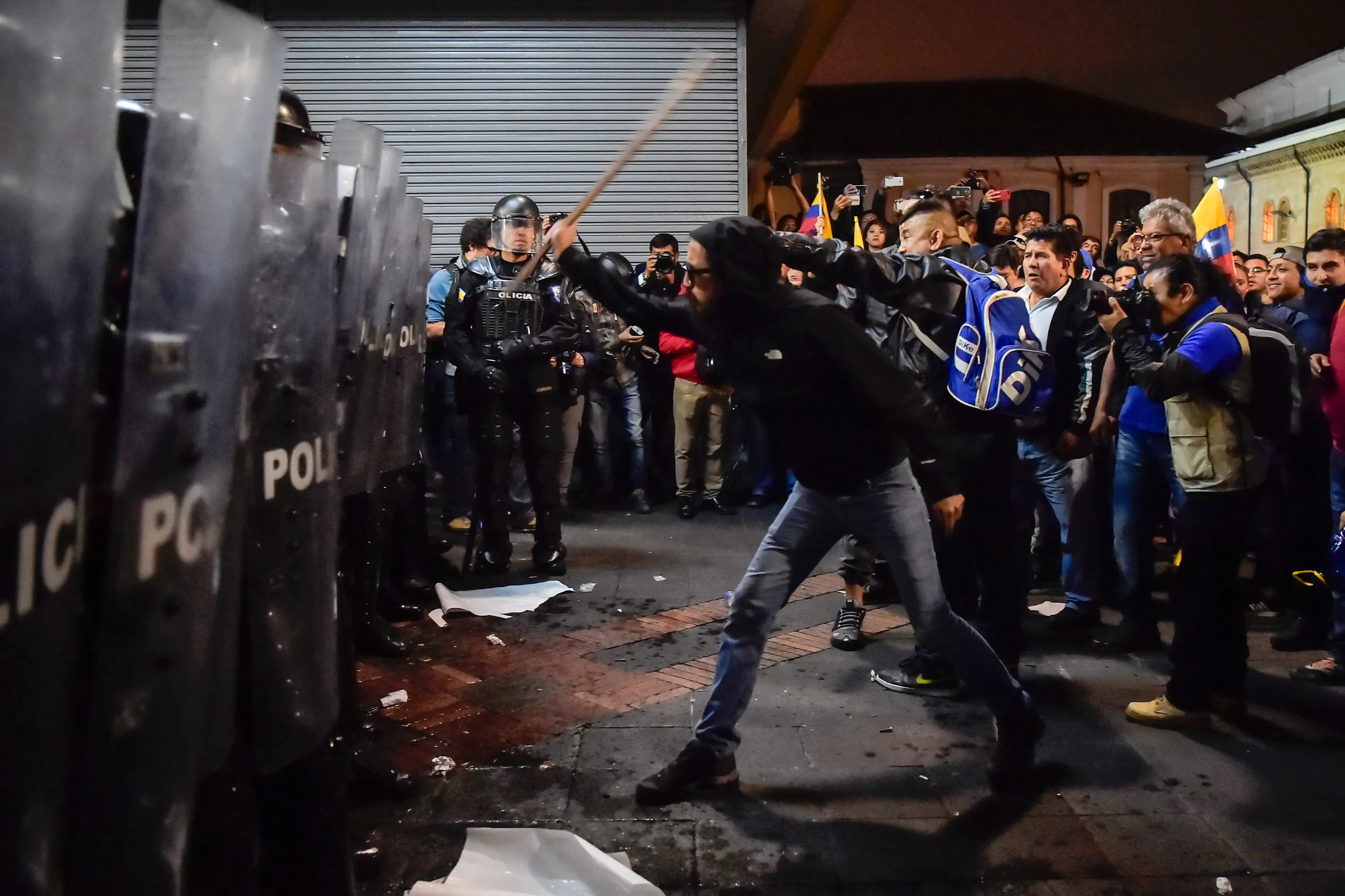 A supporter of the former Ecuadorian President, Rafael Correa, hits with a wooden pole the shields of a police line during the demonstration against the raising price of fuel in Quito, on September 13, 2018. Ecuadorian President Lenin Moreno economic measures include the removal of government subsidies to fuel. (Photo by Rodrigo Buendia/AFP Photo)