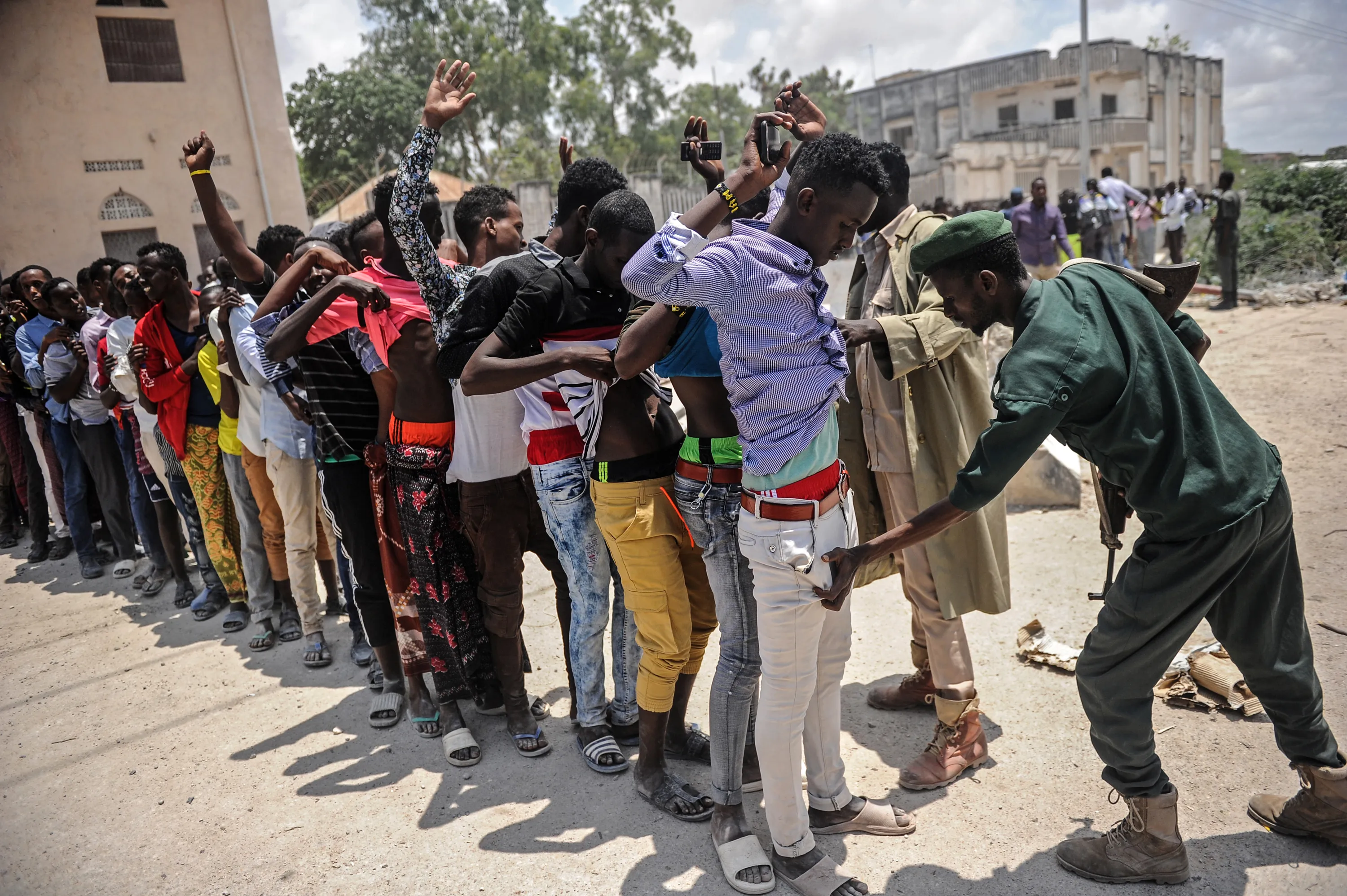 A Somali soldier checks a man at the entrance before a handover ceremony as African Union Mission to Somalia (AMISOM) leaves from the Mogadishu stadium in Mogadishu, Somalia, on August 28, 2018. The Mogadishu stadium has been occupied as a base for AMISOM since 2011 and returned as a public ground as it used to be. (Photo by Mohamed Abdiwahab/AFP Photo)