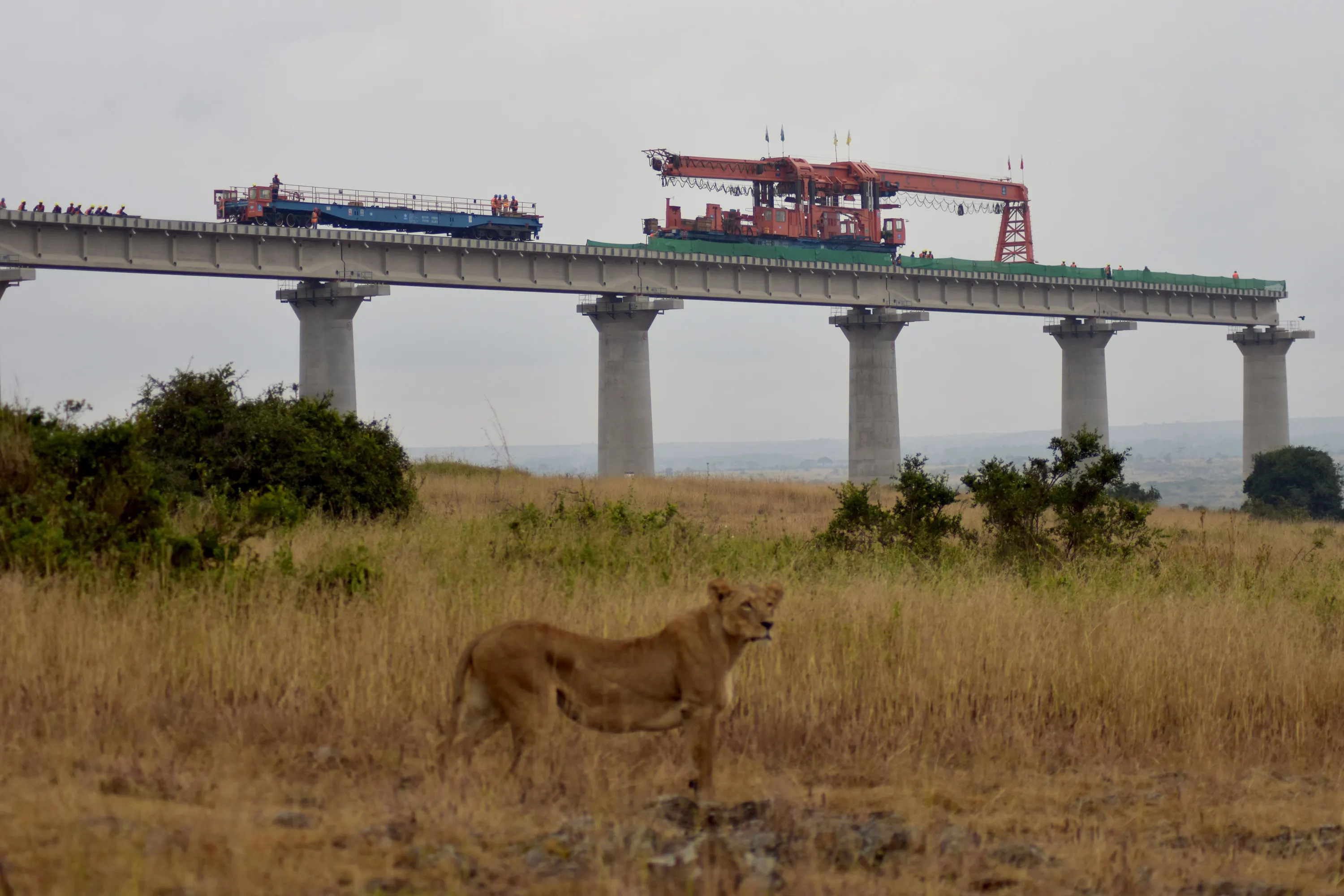 Lions roaming through Nairobi National Park in Kenya while major railway construction happens in the background, August 2018. (Photo by Aksel Stevens/Caters News Agency)