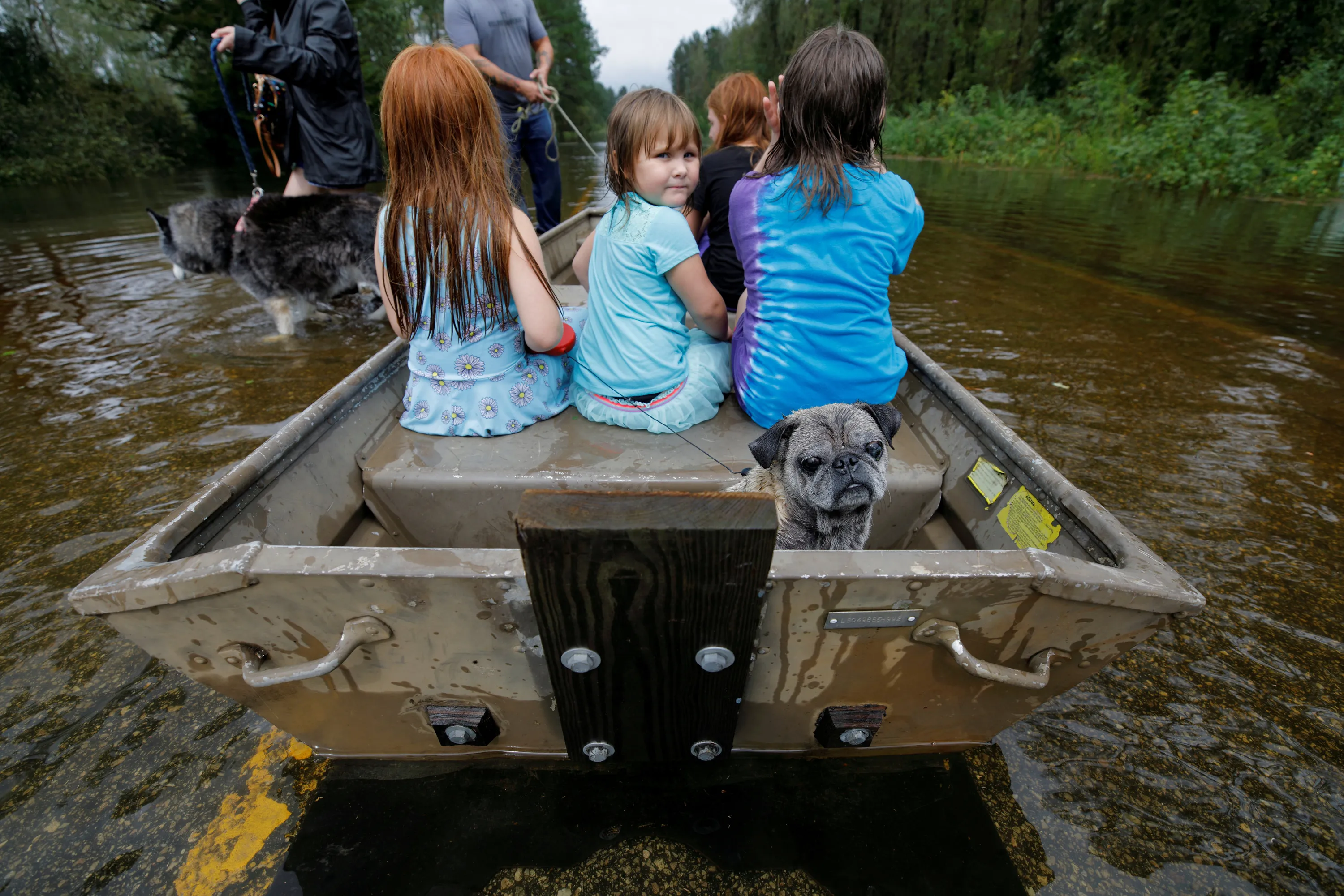 Iva Williamson, 4, peers behind her as she joins neighbors and pets in fleeing rising flood waters in the aftermath of Hurricane Florence in Leland, North Carolina, U.S., September 16, 2018. (Photo by Jonathan Drake/Reuters)