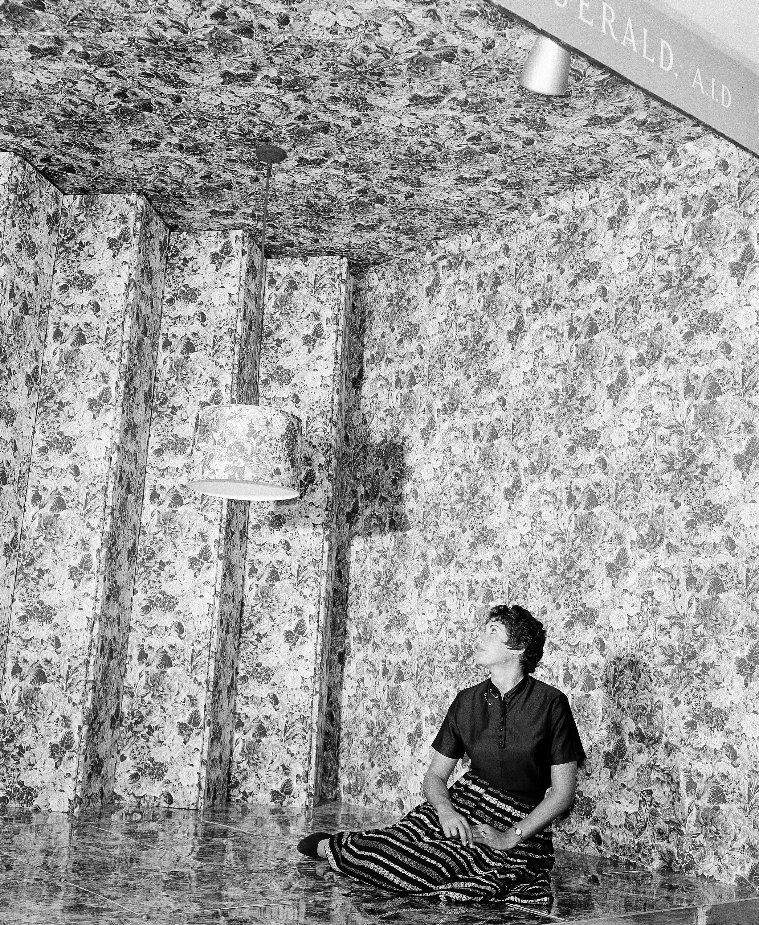 An allover pattern of bright flowered chintz is used in this suggestion for a garden supper room, designed by John Gerald, A.I.D., for the home furnishings show in New York, September 8, 1954. The chintz pattern is used for the ceiling walls, lampshade and floor, which is covered with several coats of clear plastic for protection. Gloria Hoffman adds a note of contrast. (Photo by Robert Kradin/AP Photo)