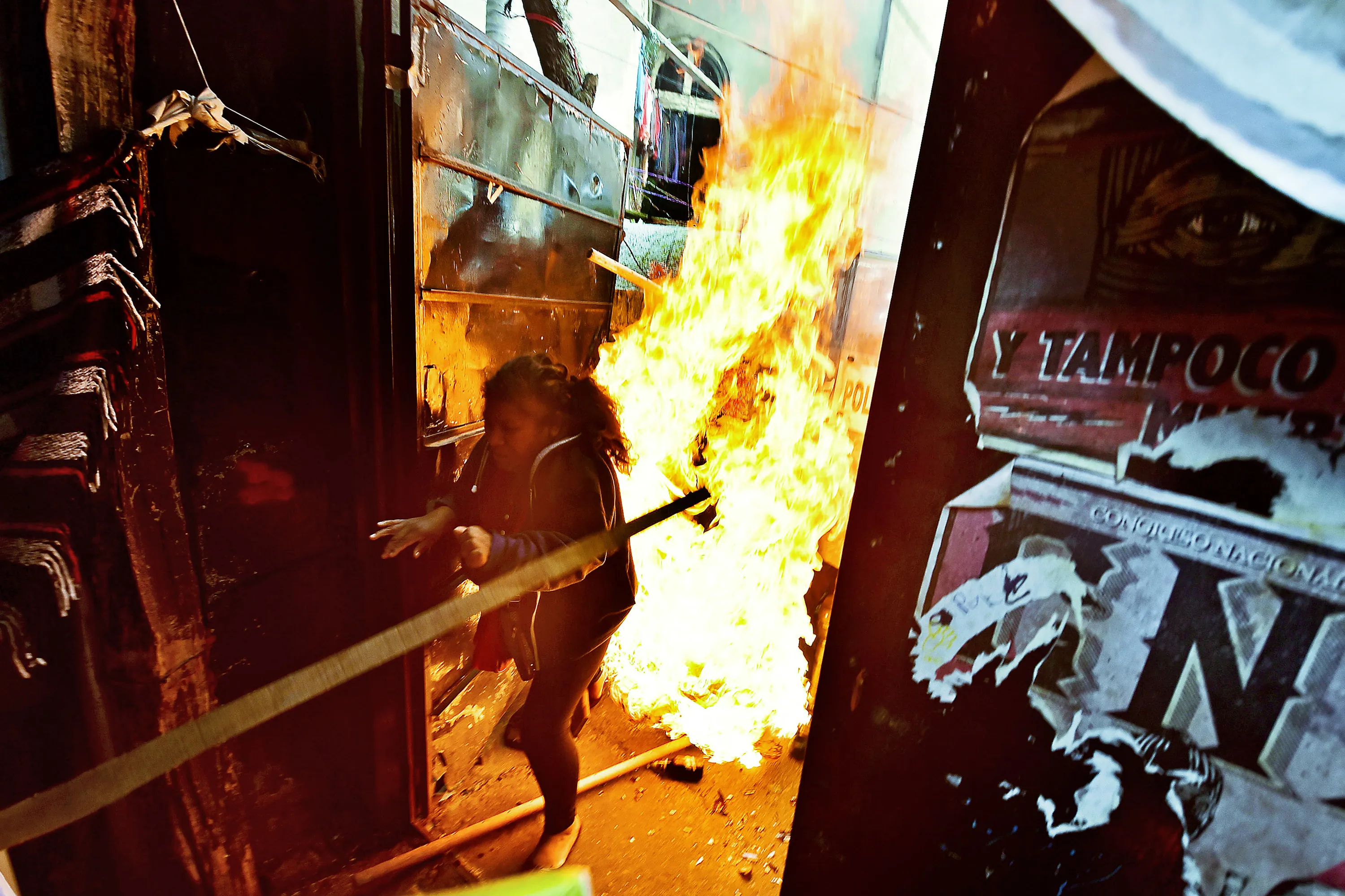 Mexican riot police clash with residents of an indigenous camp as they are evicted from the improvised homes where many had been living for years in Mexico city on September 19, 2018. (Photo by Pedro Pardo/AFP Photo)
