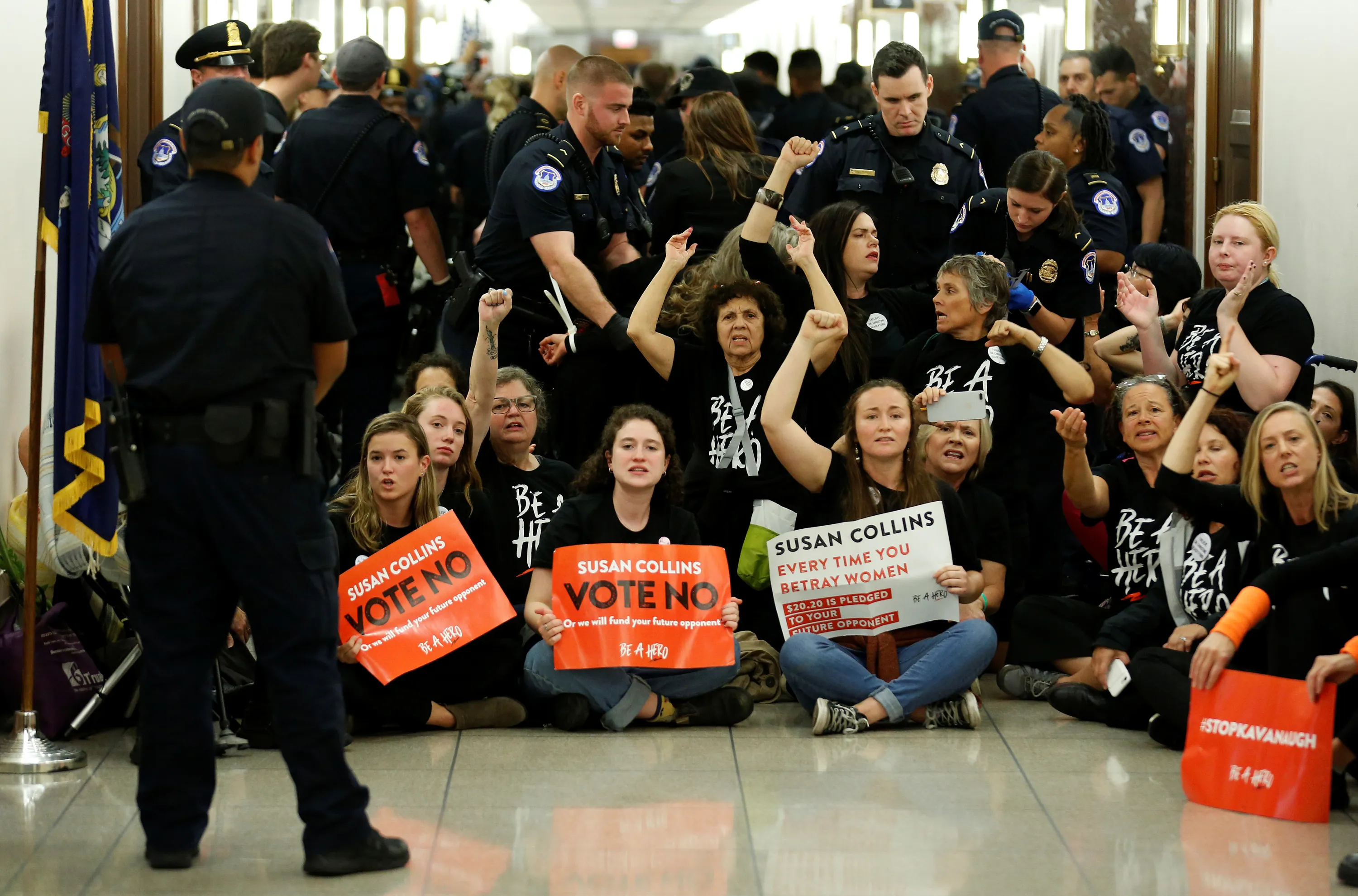 Demonstrators chant before being arrested as they protest against U.S. Supreme Court nominee Brett Kavanaugh in front of the office of Senator Susan Collins (R-ME) on Capitol Hill in Washington, U.S., September 24, 2018. (Photo by Joshua Roberts/Reuters)
