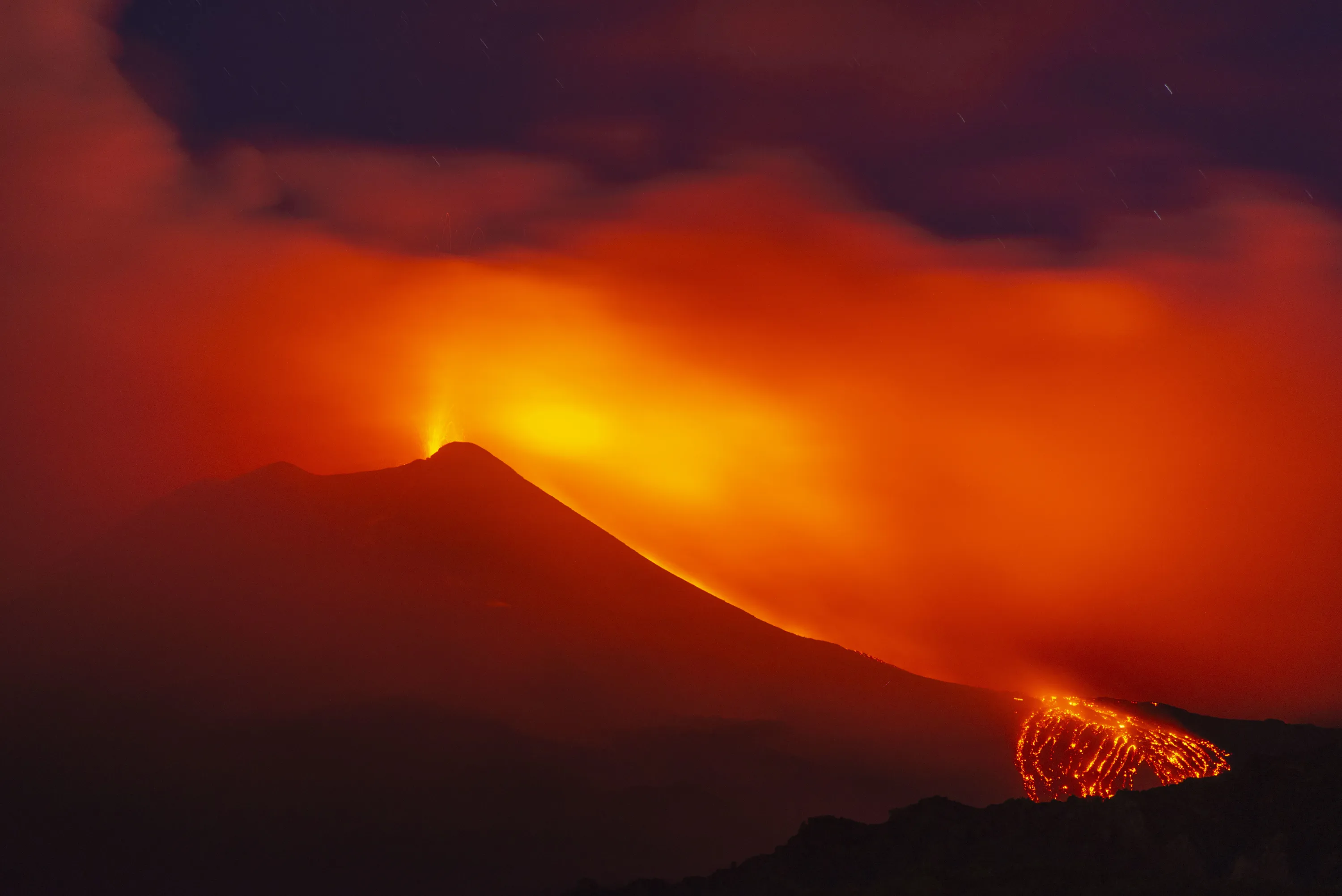 Mount Etna volcano spews lava during an eruption early Saturday, August 25, 2018. Mount Etna in Sicily has roared back into spectacular volcanic action, sending up plumes of ash and spewing lava. Italy's National Institute of Geophysics and Vulcanology (INGV) says that the volcano, which initially “re-awoke” in late July, sprang into fuller action Thursday evening by shooting up chunks of flaming lava as high as 150 meters (500 feet) almost constantly. (Photo by Salvatore Allegra/AP Photo)