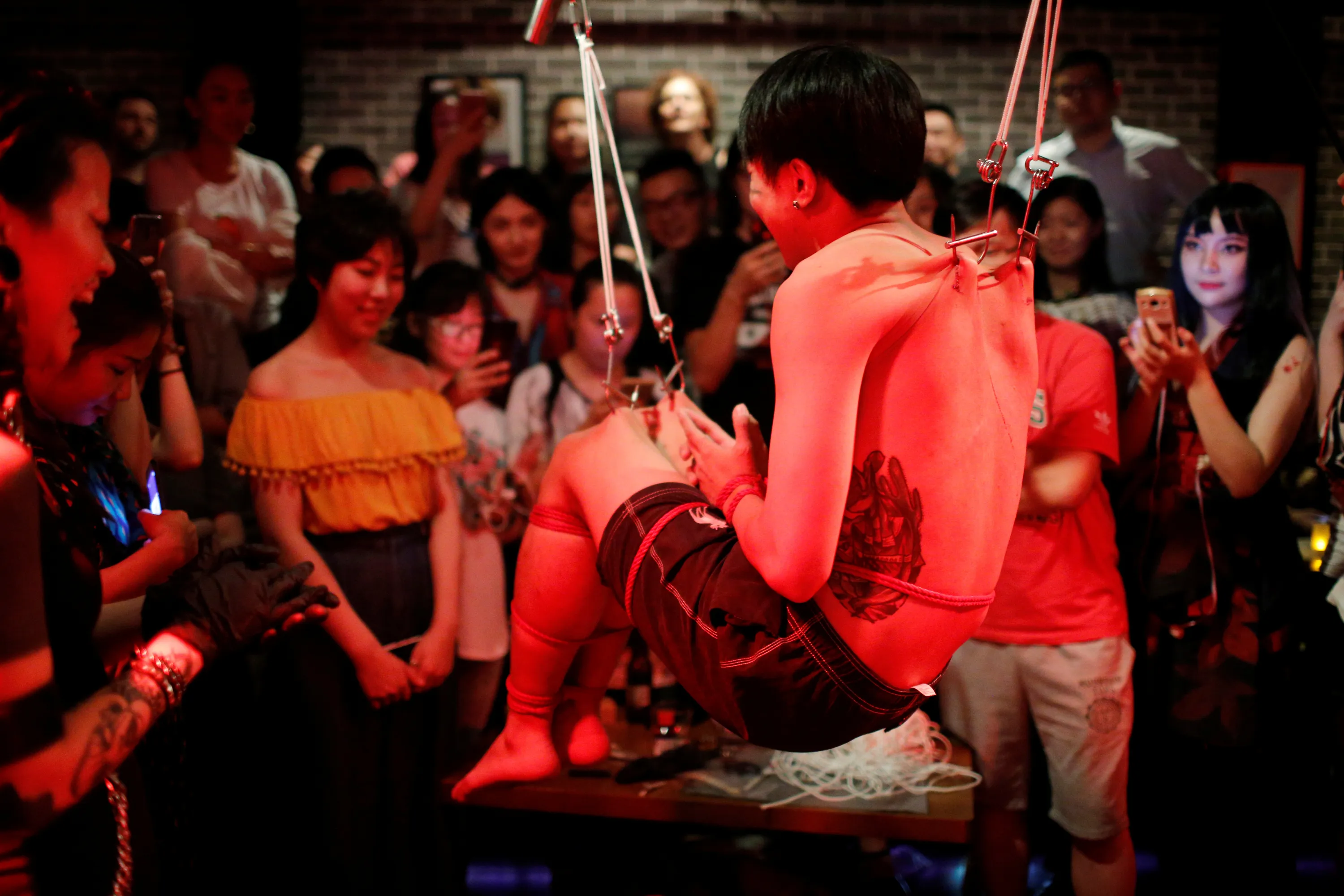 Spectators watch as Viktor Liu is suspended from hooks pierced through his skin by professional body artist Wei Yilaien at a bar in Shanghai, China on September 16, 2018. (Photo by Aly Song/Reuters)