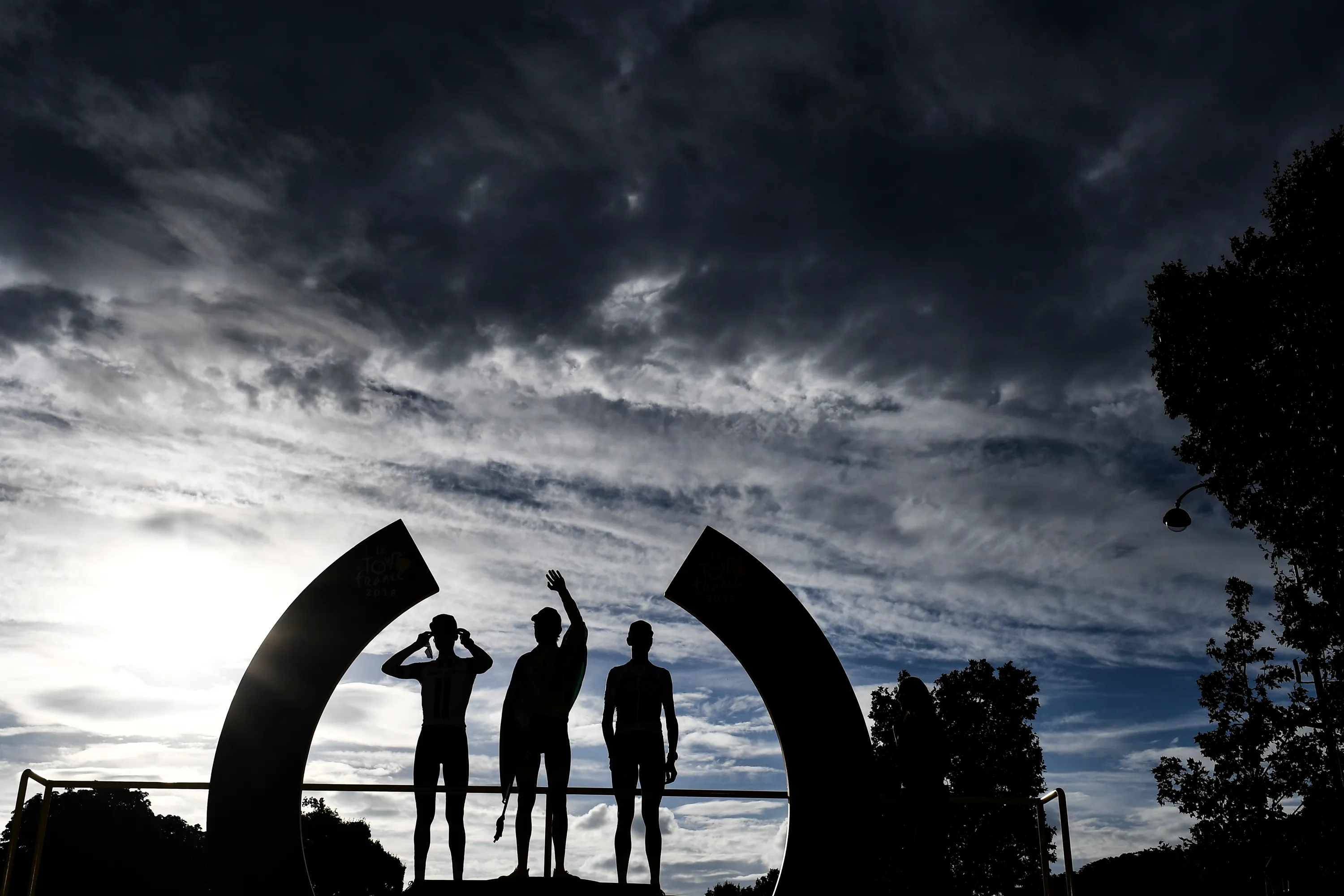 Tour de France 2018 winner Great Britain's Geraint Thomas (C), wearing the overall leader's yellow jersey, second-placed Netherlands' Tom Dumoulin (L) and third-placed Great Britain's Christopher Froome (R) celebrate on the podium after the 21st and last stage of the 105th edition of the Tour de France cycling race between Houilles and Paris Champs-Elysees, on July 29, 2018. (Photo by Jeff Pachoud/AFP Photo)