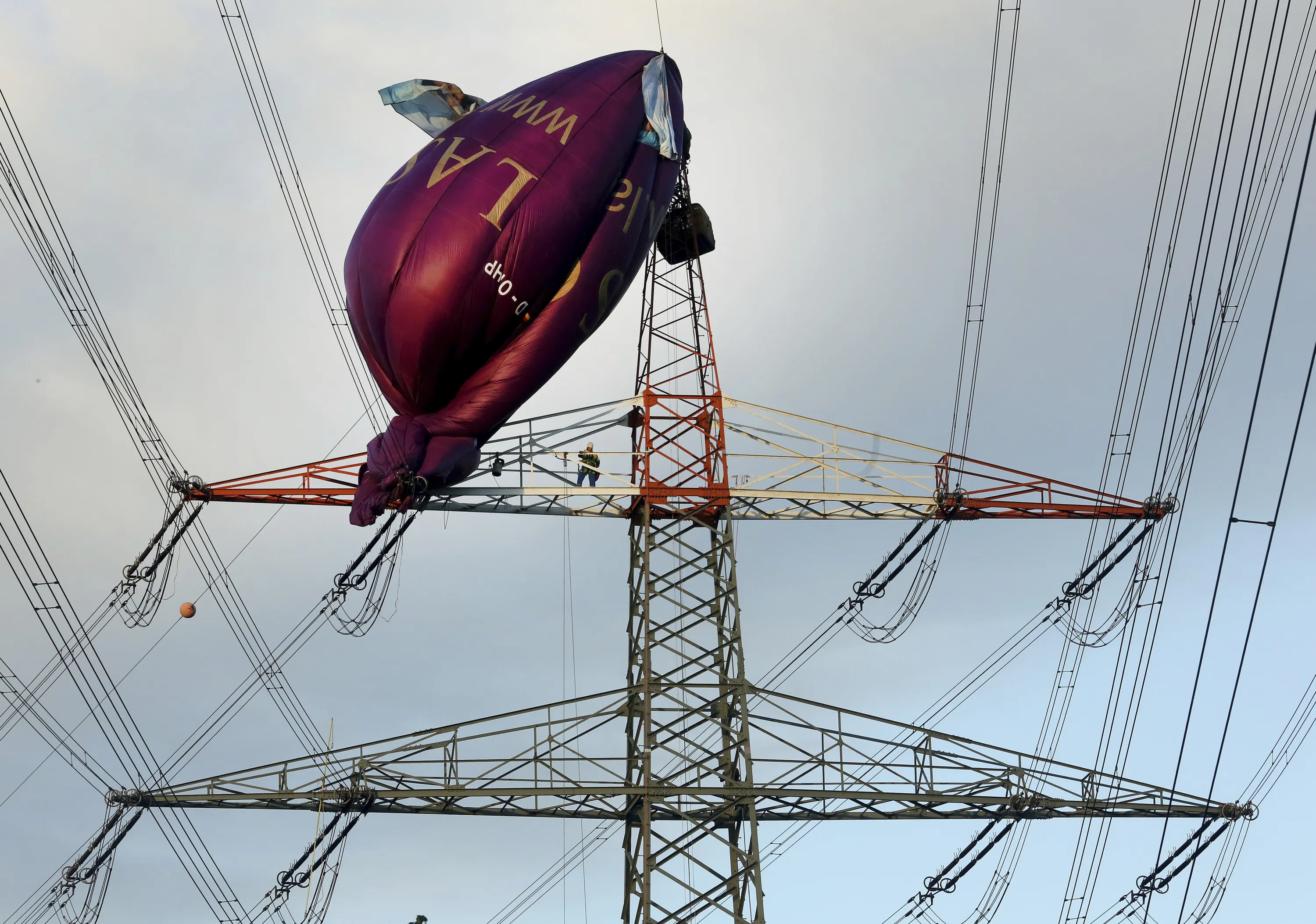 A hot air balloon sits on top of a high-voltage power line in Bottrop, Monday, October 1, 2018 after it collided the evening before. Six passengers were rescued from a height of 65 meters (210 feet). (Photo by Roland Weihrauch/DPA via AP Photo)