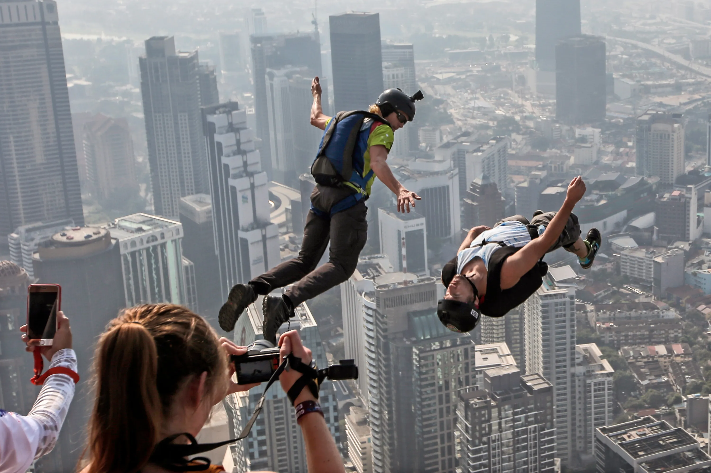 BASE jumpers jump from a 300m high deck during the Kuala Lumpur Tower International Jump in Kuala Lumpur, Malaysia, 30 September 2018. More than 140 BASE (Building, Antenna, Span and Earth) jumpers took part in this extreme sport event. (Photo by Ahmad Yusni/EPA/EFE)