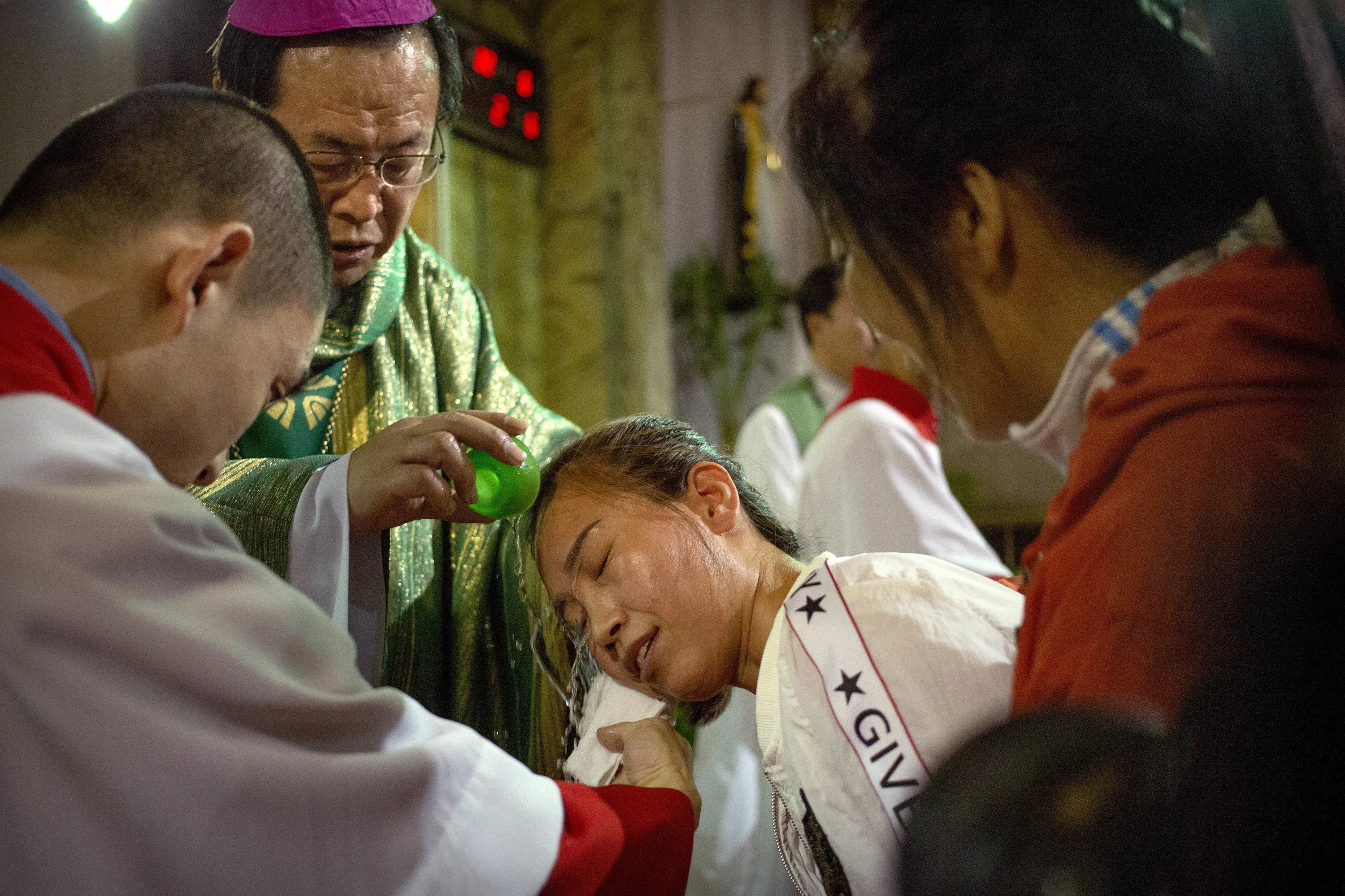 In this September 22, 2018, photo, Chinese bishop Joseph Li Shan, top left, baptizes a member of the faithful during a mass at the Cathedral of the Immaculate Conception, a government-sanctioned Catholic church in Beijing. The Vatican’s breakthrough agreement to give China some say over bishop appointments has critics accusing the church of caving in to the ruling Communist Party just as it is waging a sweeping crackdown on religion. Others say it’s an imperfect but much-needed step toward uniting Catholics in the world’s most populous country. (Photo by Mark Schiefelbein/AP Photo)