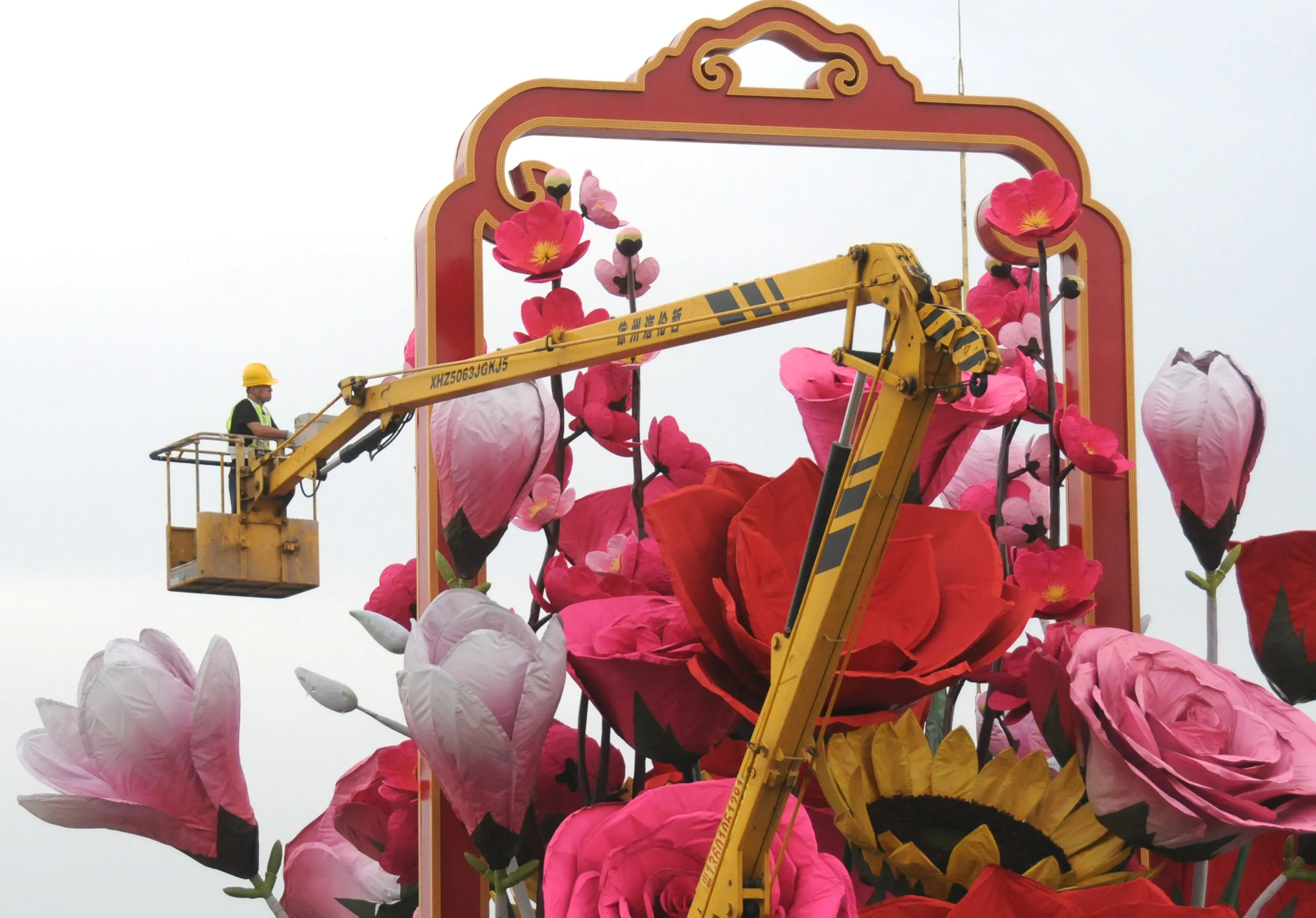 A man works on a flower-themed installation set up before the Chinese National Day, at the Tiananmen Square in Beijing, China September 18, 2018. (Photo by Reuters/China Stringer Network)