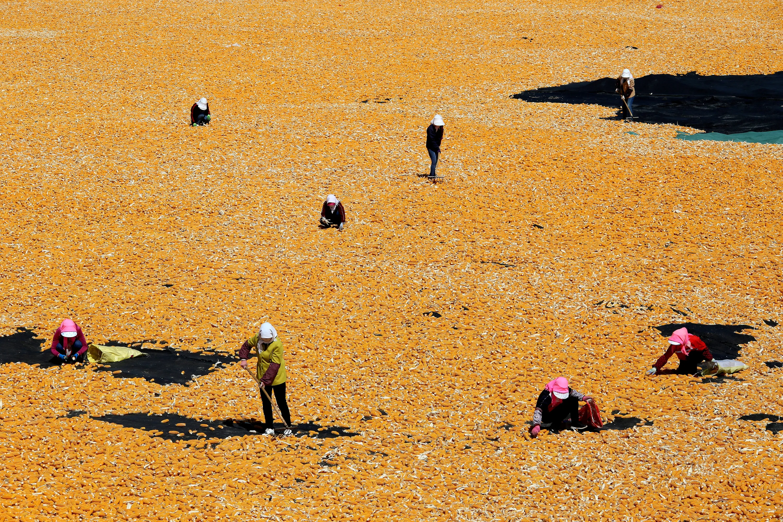 Farmers lay newly harvested corn cobs to dry at a field in Zhangye, Gansu province, China September 20, 2018. (Photo by Reuters/China Stringer Network)