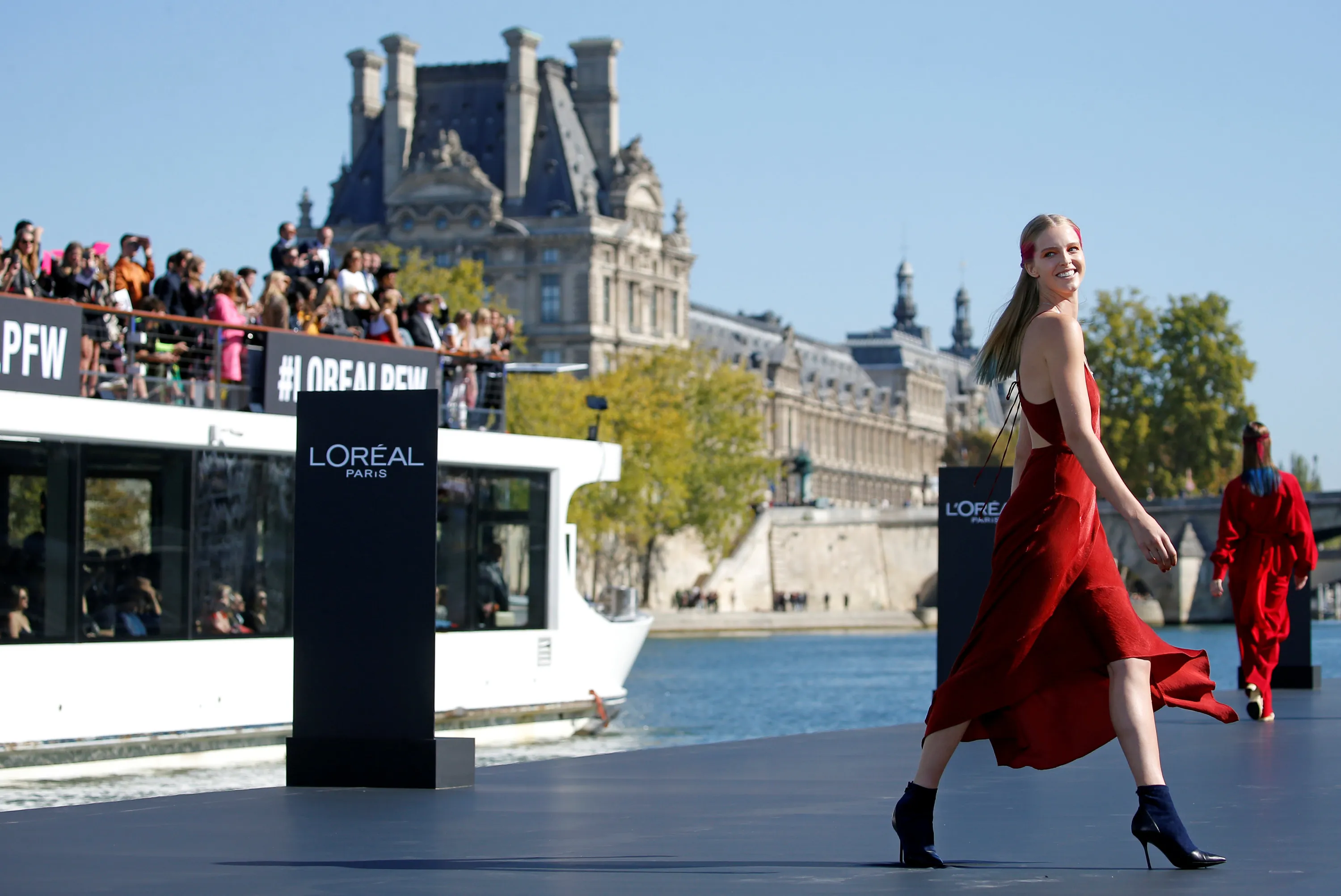 A model presents a creation on a giant catwalk installed on a barge on the Seine River during a public event organized by French cosmetics group L'Oreal as part of Paris Fashion Week, France, September 30, 2018. (Photo by Stephane Mahe/Reuters)