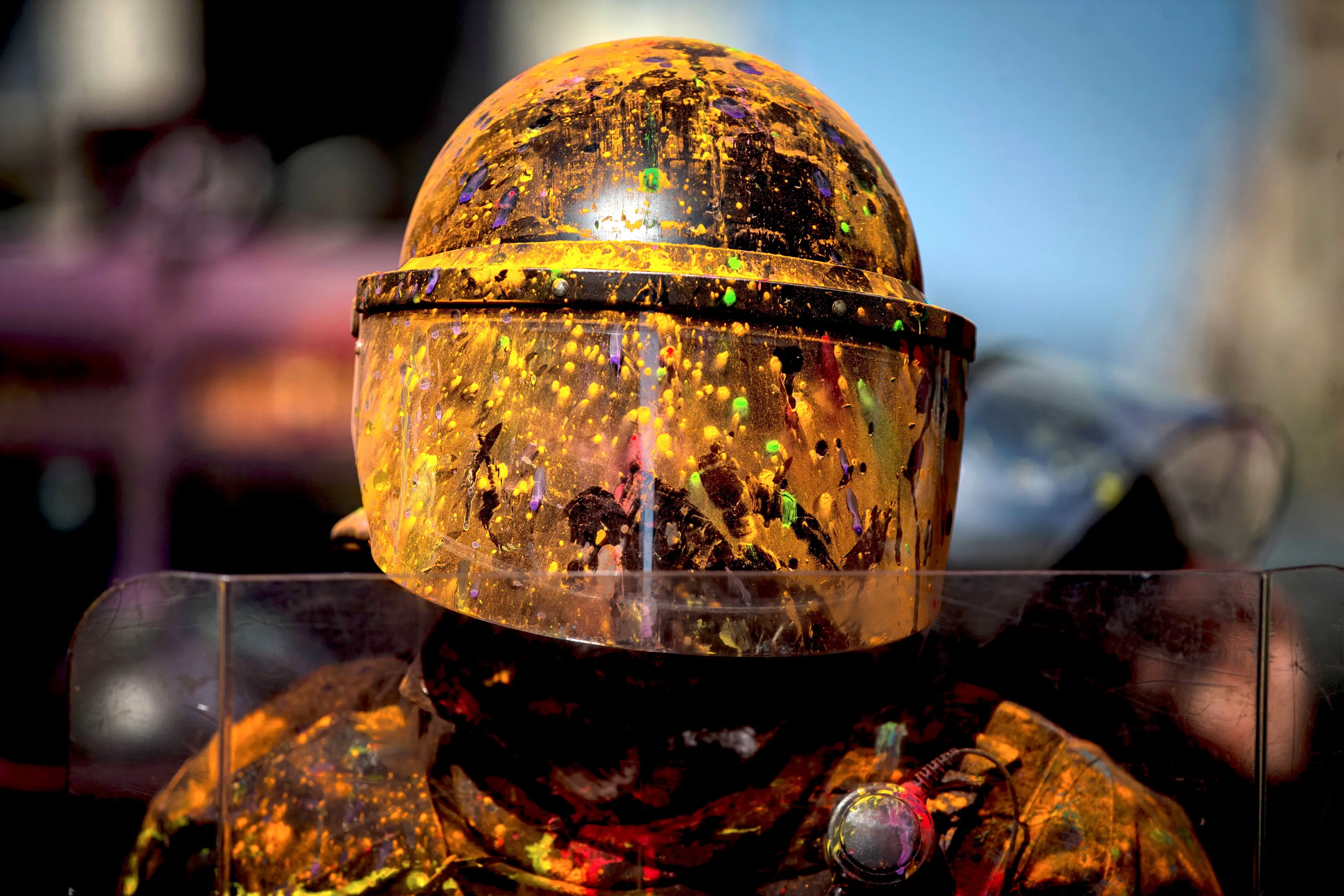 A regional riot Police agent is seen smeared with paint as he and others try to stop pro-independence supporters from reaching the National Police headquarters in Barcelona, Spain, where a protest of National Police and Civil Guard agents is taking place, 29 September 2018. The pro-independence supporters where gathering at Sant Jaume square in Barcelona when they decided to head towards the Police headquarters to sabotage the National Police and Civil Guard protest. (Photo by Enric Fontcubierta/EPA/EFE)