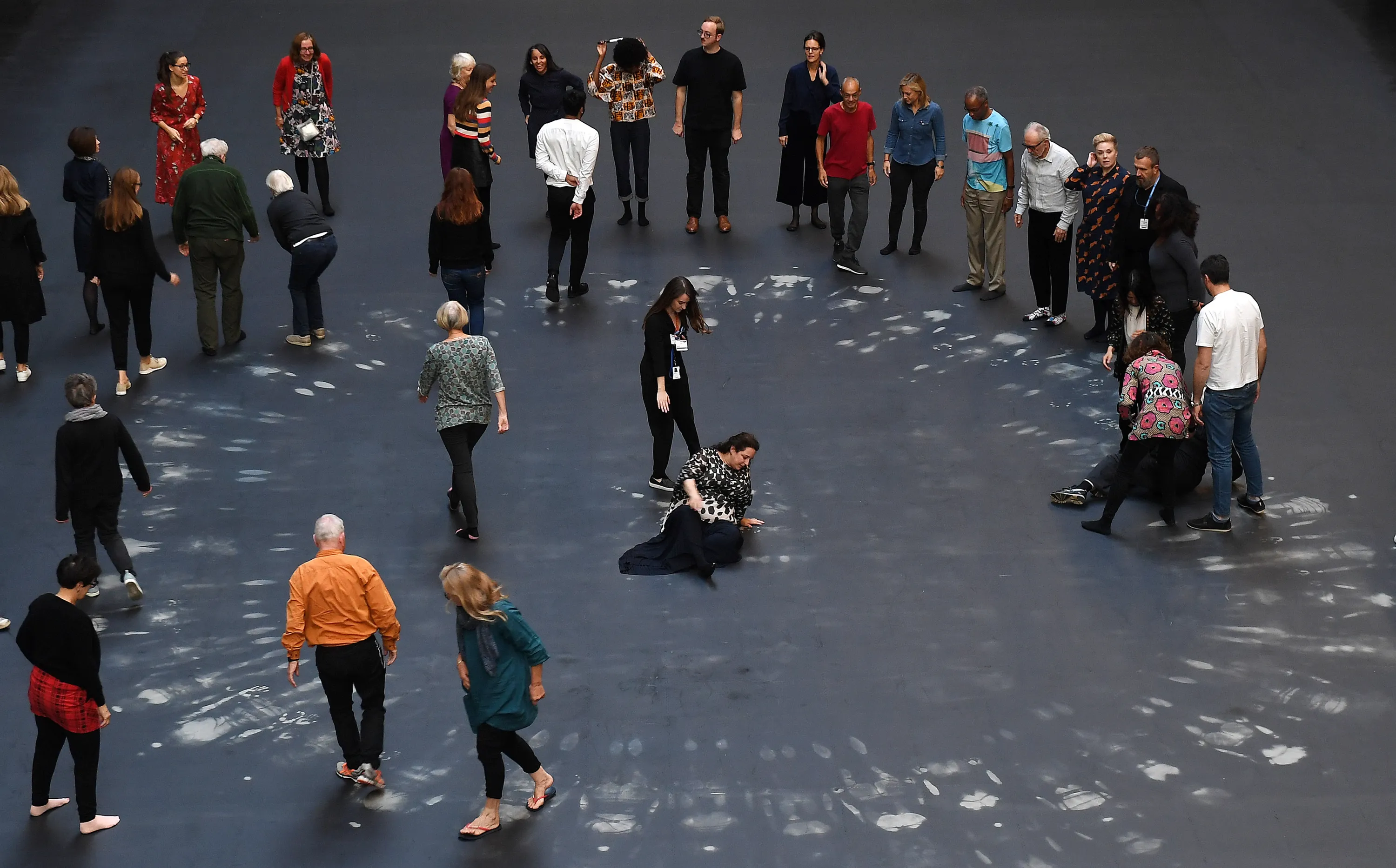 Cuban artist and activist Tania Bruguera (C) stands with volunteers on her installation during its unveiling in the Turbine Hall at Tate Modern in London, Britain, 01 October 2018. The art project created in response to the global migration crisis as part of the annual Hyundai Commission will be on show from 02 October 2018 to 24 February 2019. The installation “invites visitors to take part in symbolic actions by revealing a hidden image beneath a heat-sensitive floor”. (Photo by Andy Rain/EPA/EFE)