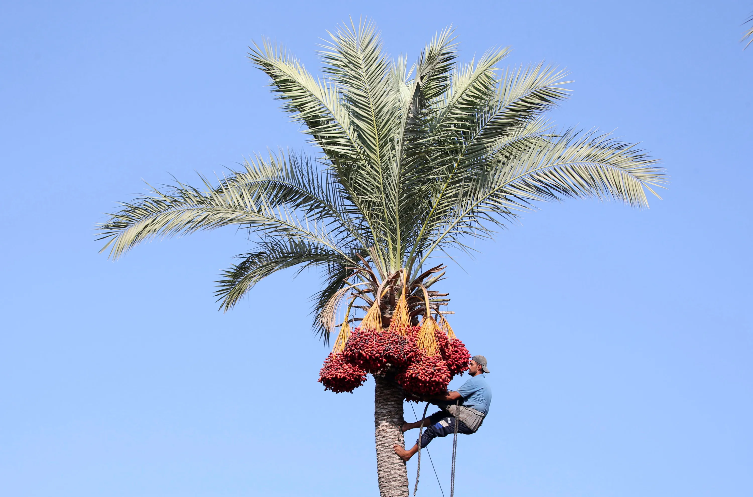 A Palestinian man harvests dates from a palm tree in Deir al-Balah, in the central Gaza Strip September 23, 2018. (Photo by Ibraheem Abu Mustafa/Reuters)