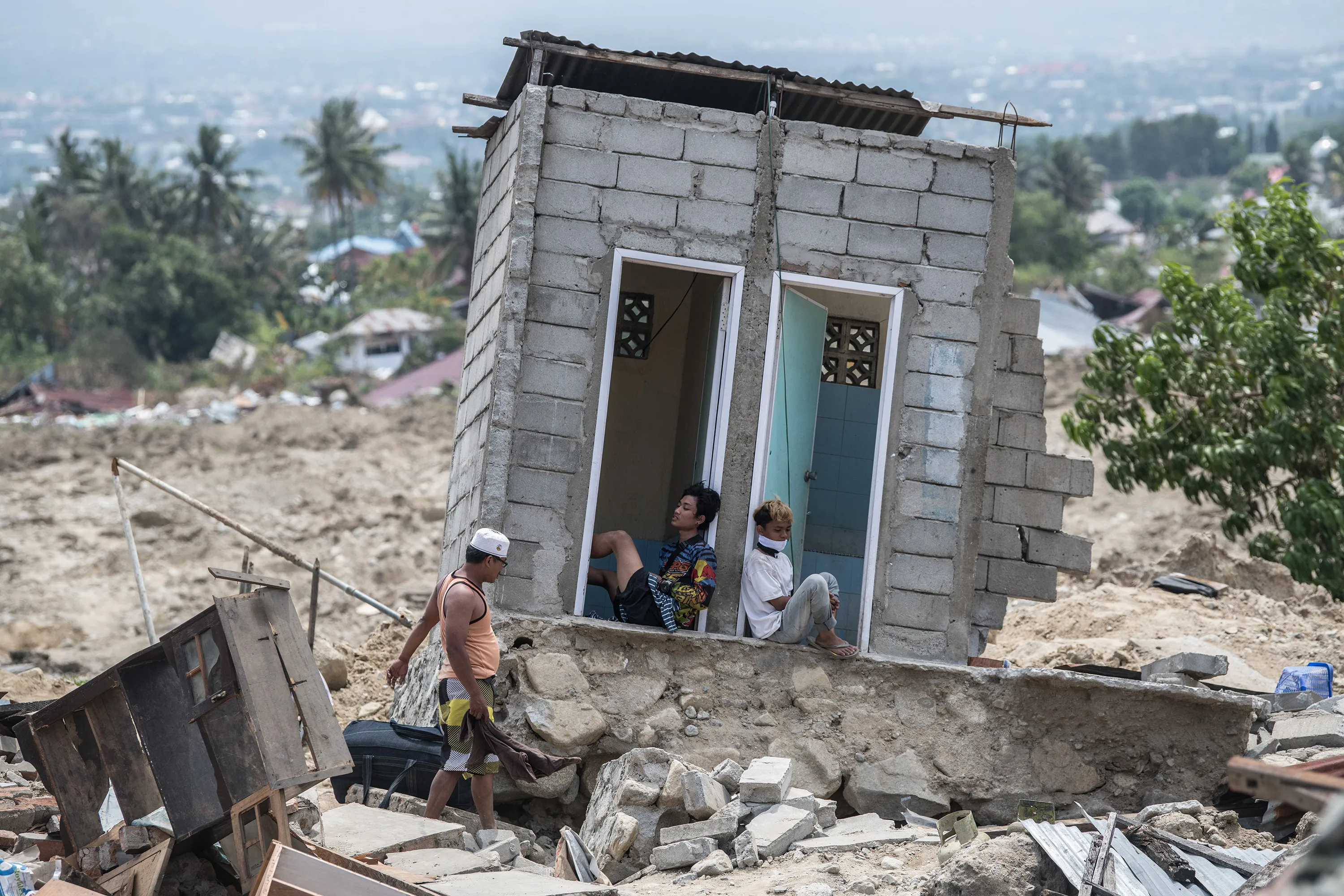 People rest in what was a toilet block in an area that was completely destroyed by an earthquake, on October 04, 2018 in Palu, Indonesia. The death toll from last weeks earthquake and tsunami has risen to at least 1,400, with time running out to rescue survivors six days after the disaster struck, and food, water, fuel and medicine were still slow to reach the hardest-hit areas outside the city of Palu on Sulawesi island. A tsunami triggered by a magnitude 7.5 earthquake slammed into Indonesia's coastline on the island of Sulawesi which destroyed or damaged over 66,000 homes as tensions are running high and Indonesia's military said it will shoot looters after desperate survivors emptied shops of food and water. (Photo by Carl Court/Getty Images)