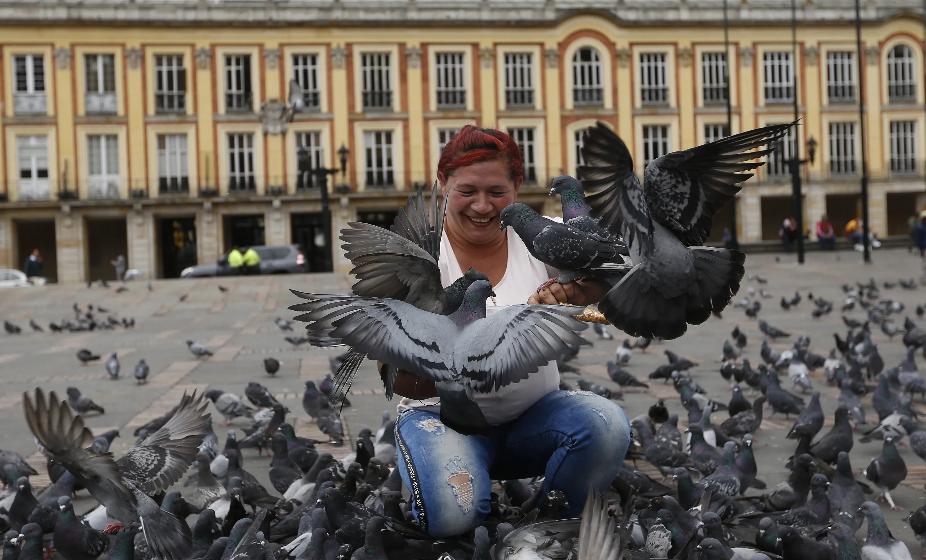 A woman feeds pigeons at Bolivar Square in Bogota, Colombia, Tuesday, October 2, 2018. Colombia's capital is trying to fight pigeon overpopulation by urging people to stop feeding them. (Photo by Fernando Vergara/AP Photo)
