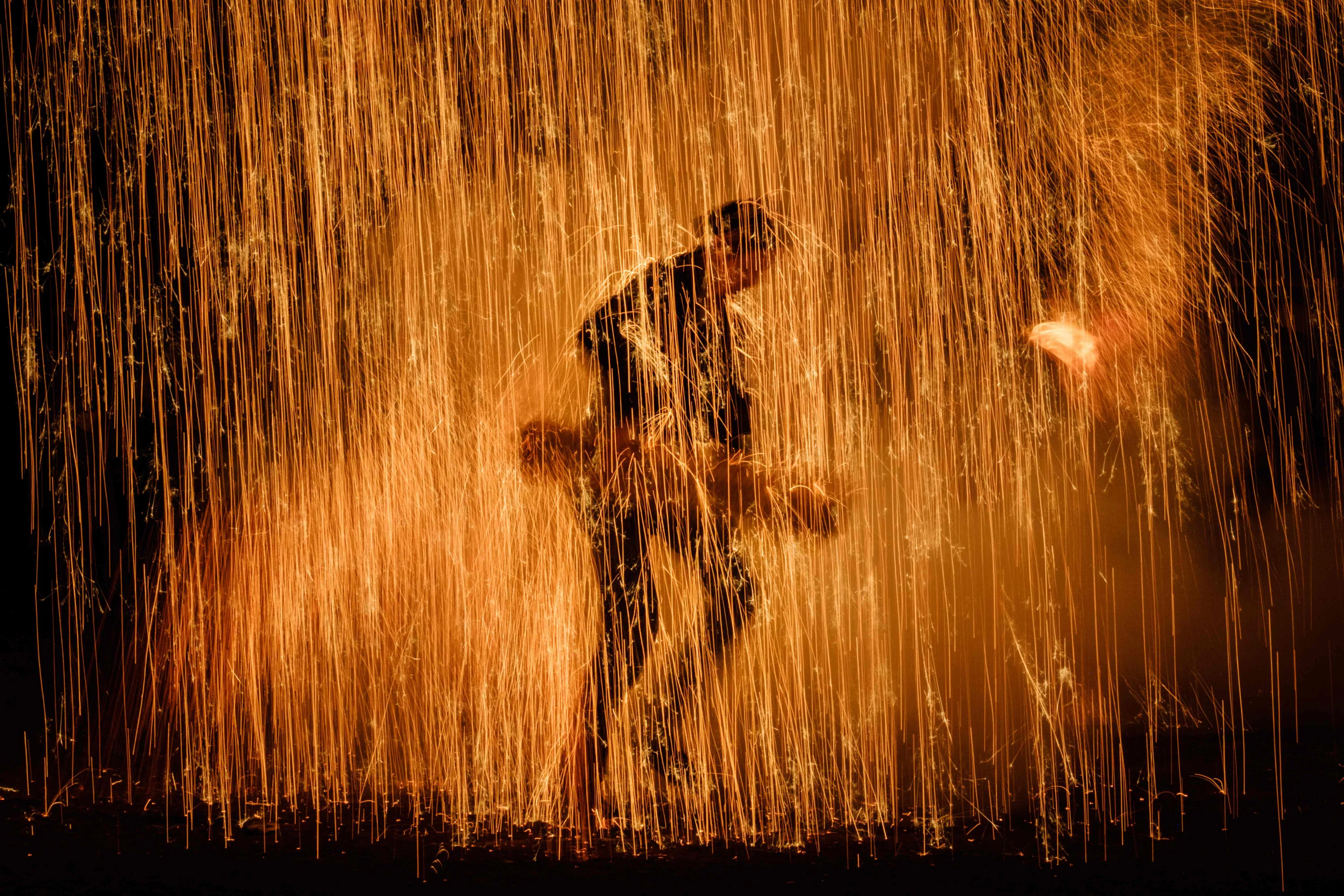 This picture taken on July 20, 2018 shows a man holding his handmade Tezutsu hanabi (handheld fireworks) dedicated to the Yoshida Shrine as a part of a Shinto ritual, on the eve of the Toyohashi Gion festival, in Toyohashi, central Japan. Every year, each male member of the shrine makes his own set of fireworks from bamboo covered by straw ropes with a loaded gun and metal powder, in a tradition that has been practiced for more than 350 years, according to an old document at the shrine. (Photo by Yasuyoshi Chiba/AFP Photo)
