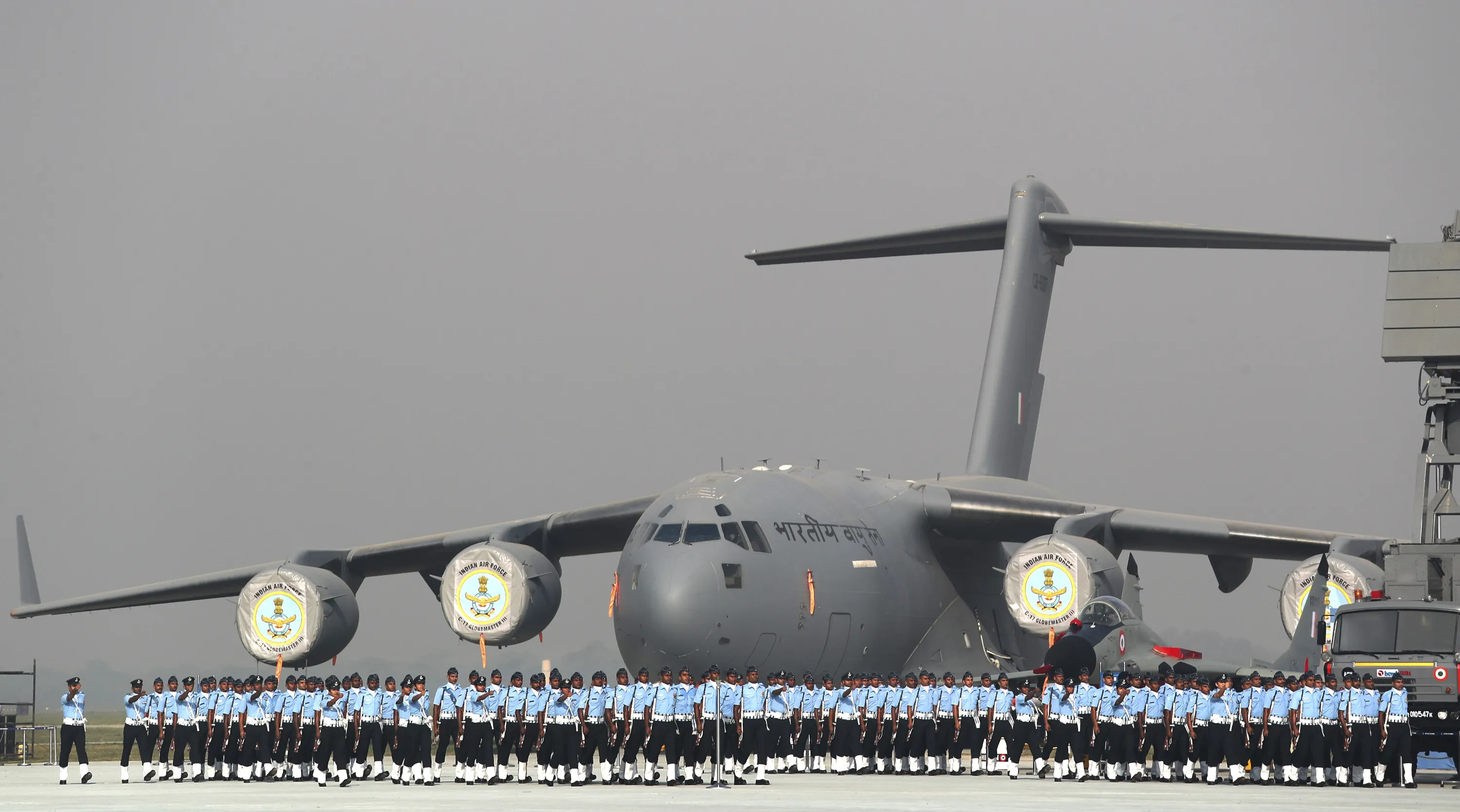 In this October 8, 2018, photo, Indian Air Force soldiers march past their C-17 Globemaster military transport aircraft during the Indian Air Force day parade at the Hindon air base on the outskirts of New Delhi, India. Air Force Day is celebrated to mark the day the Indian air force was officially established in 1932. Apart from defending Indian air space, the air force also delivers humanitarian aid and disaster relief material during natural calamities. (Photo by Manish Swarup/AP Photo)
