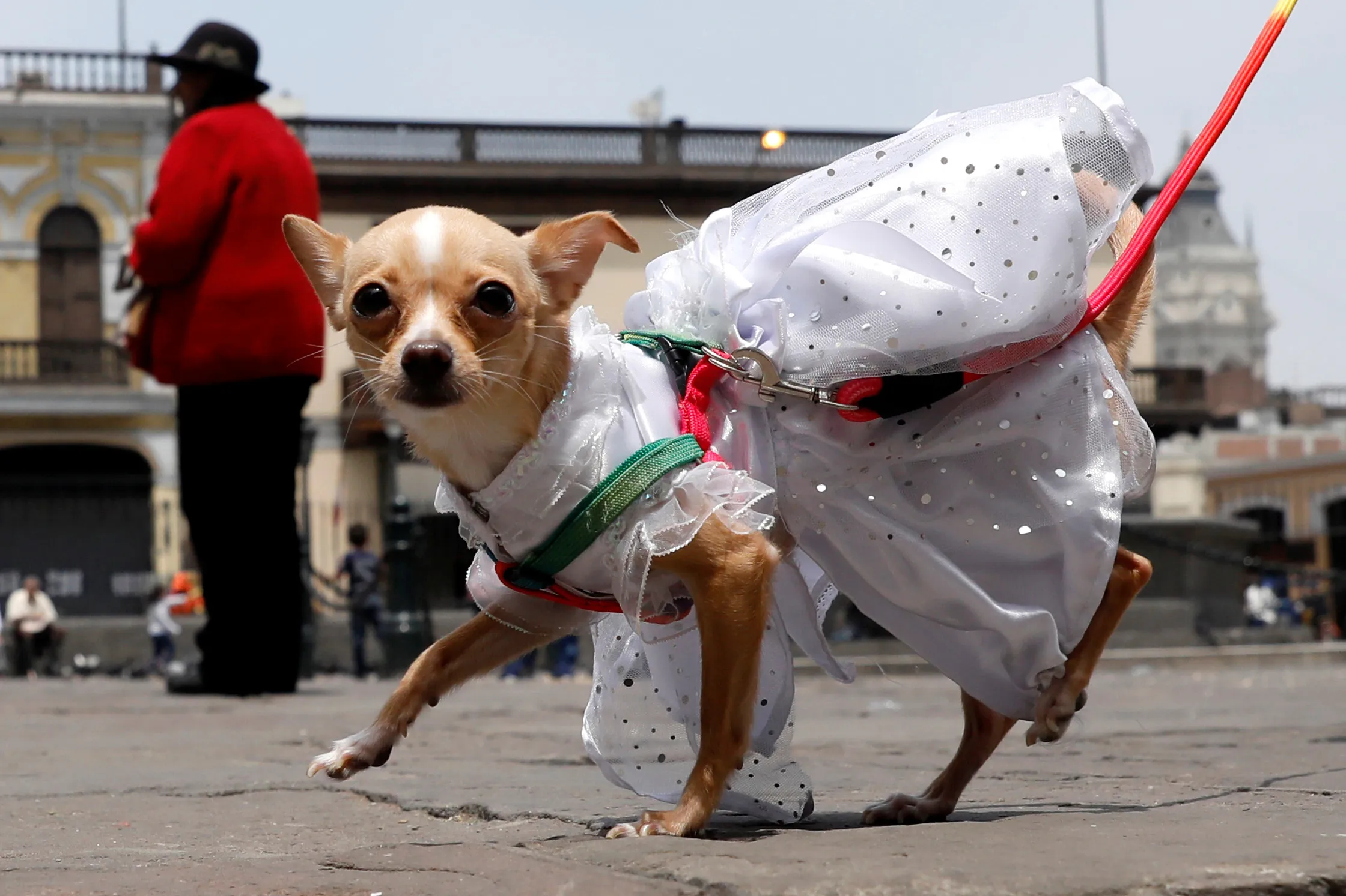 A dog dressed in costume is seen during a religious and blessing ceremony outside the San Francisco Church in Lima, Peru on October 4, 2018. (Photo by Guadalupe Pardo/Reuters)