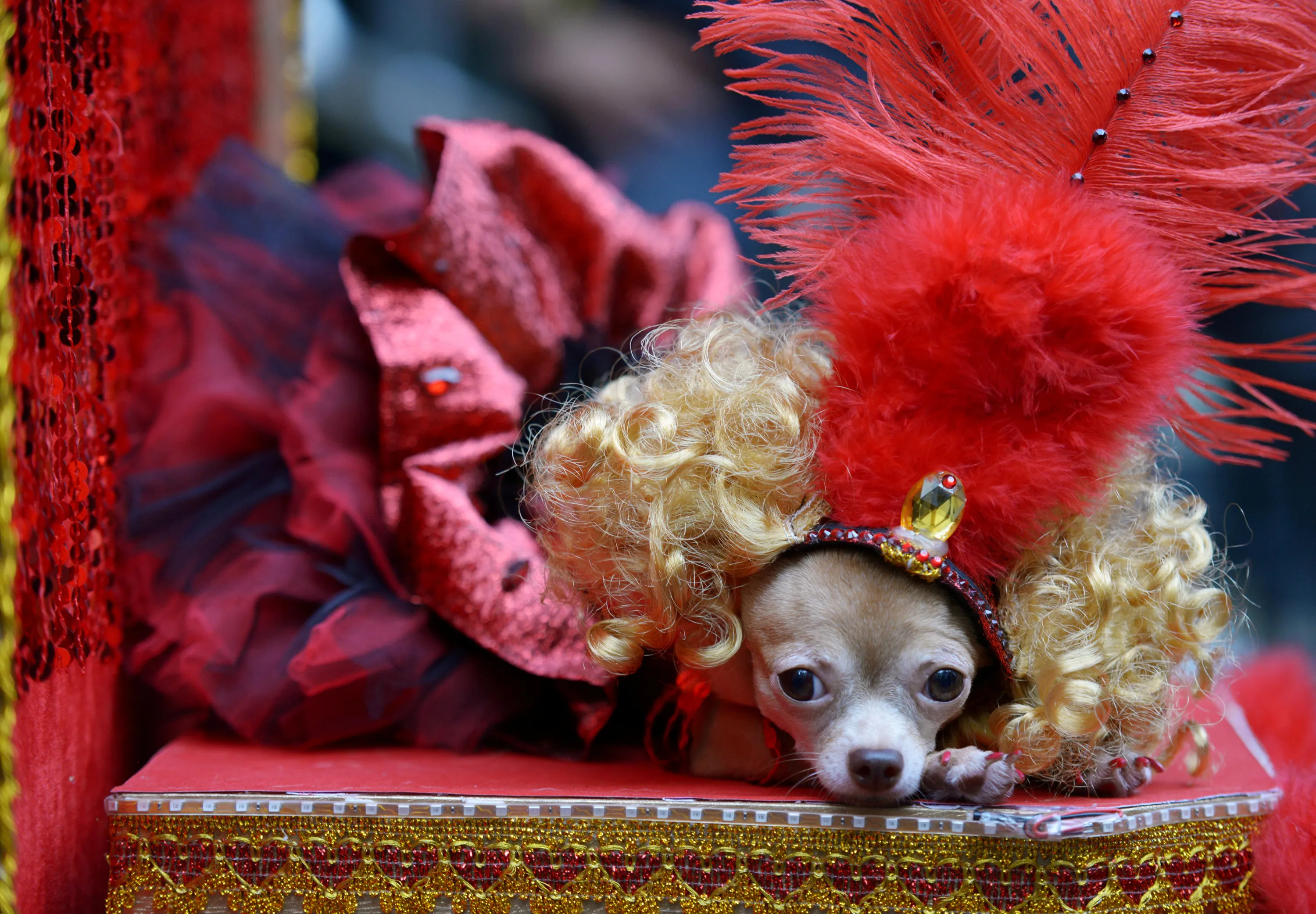 A Chihuahua puppy dressed like a Moulin Rouge dancer rests during an activity for World Animal Day at Eastwood Mall, Quezon City, Metro Manila, Philippines October 7, 2018. (Photo by Eloisa Lopez/Reuters)
