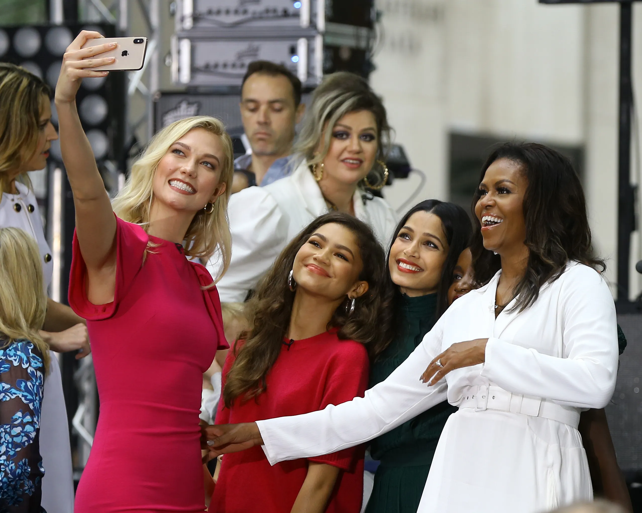 Former First Lady Michelle Obama takes a selfie with Karlie Kloss, Zendaya, Frieda Pinto and Kelly Clarkson on NBC Today Show celebration of International Day of the Girl on Rockefeller Plaza in New York City, New York on October 11, 2018. (Photo by Christopher Peterson/Splash News and Pictures)