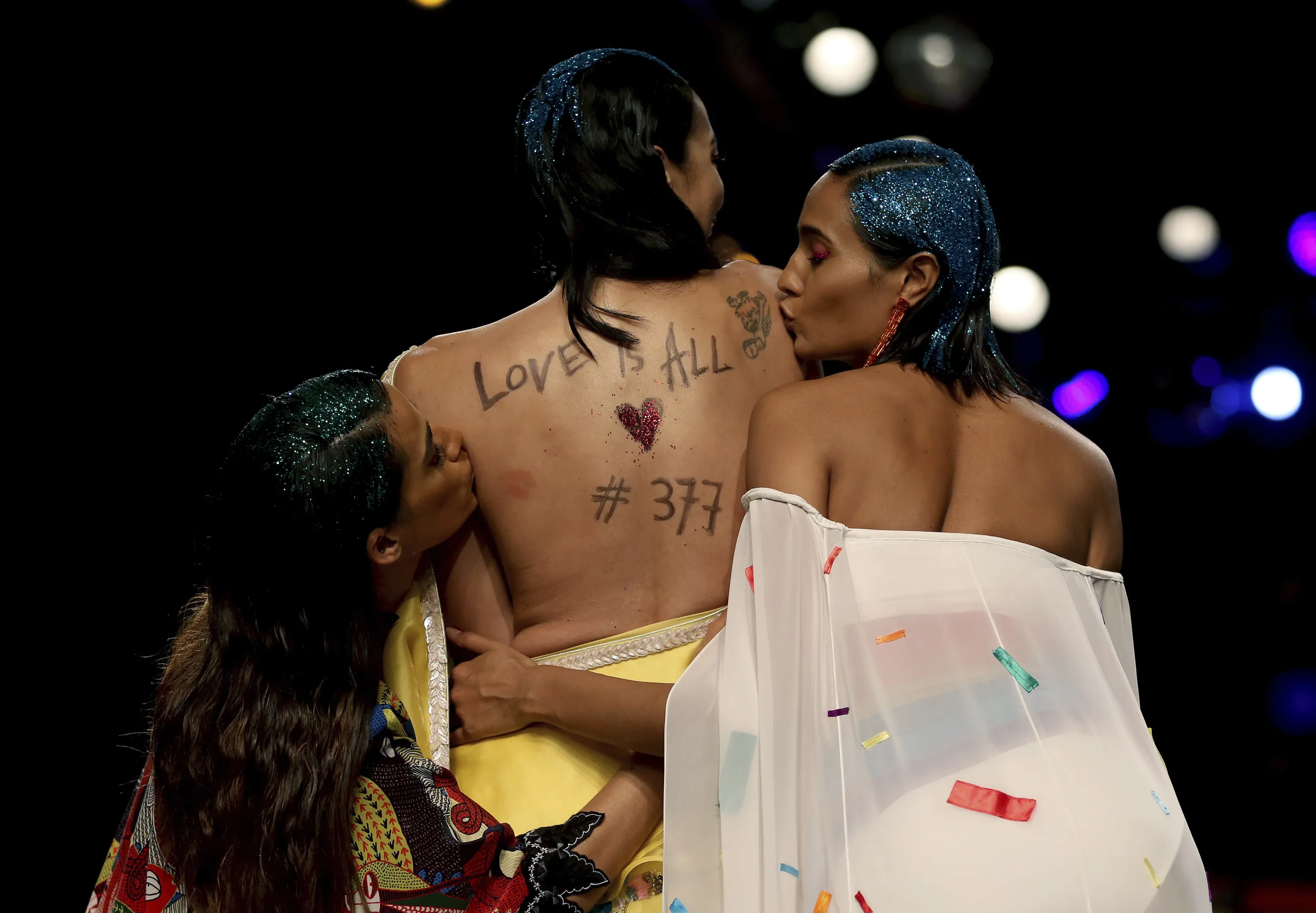 Models kiss the back of another model, with a message on her back, during the grand finale of Lotus Make-up India Fashion Week based on “Rainbow” theme, an emblem for the LGBTQ community, in New Delhi, India, Sunday, October 14, 2018. According to Fashion Design Council of India, the “Rainbow” show, wherein 40 designers showcased their creations, was a tribute to mark the historic judgement by the Supreme Court of India which struck down a colonial-era law that made homosexual acts punishable by up to 10 years in prison. (Photo by Altaf Qadri/AP Photo)
